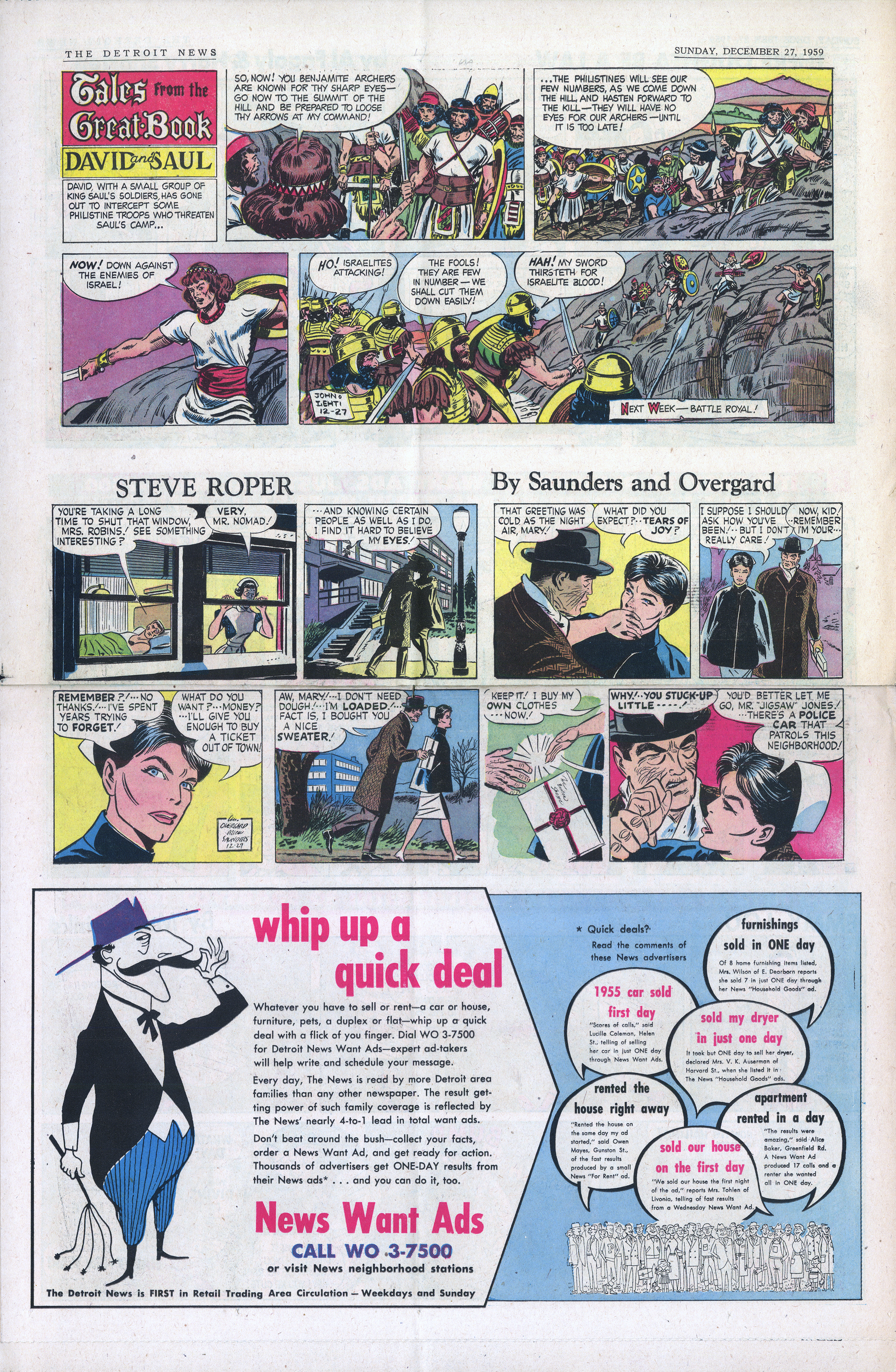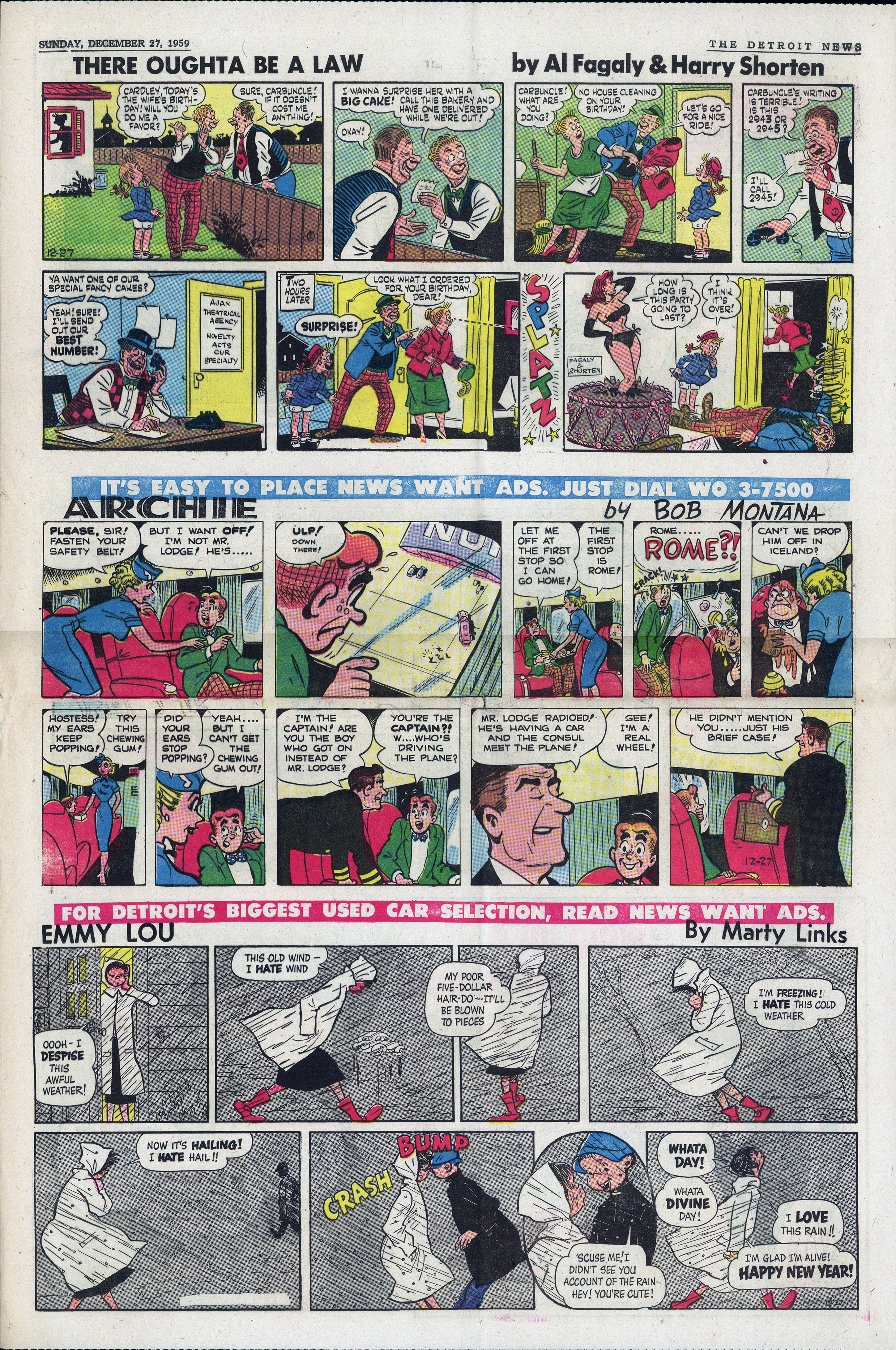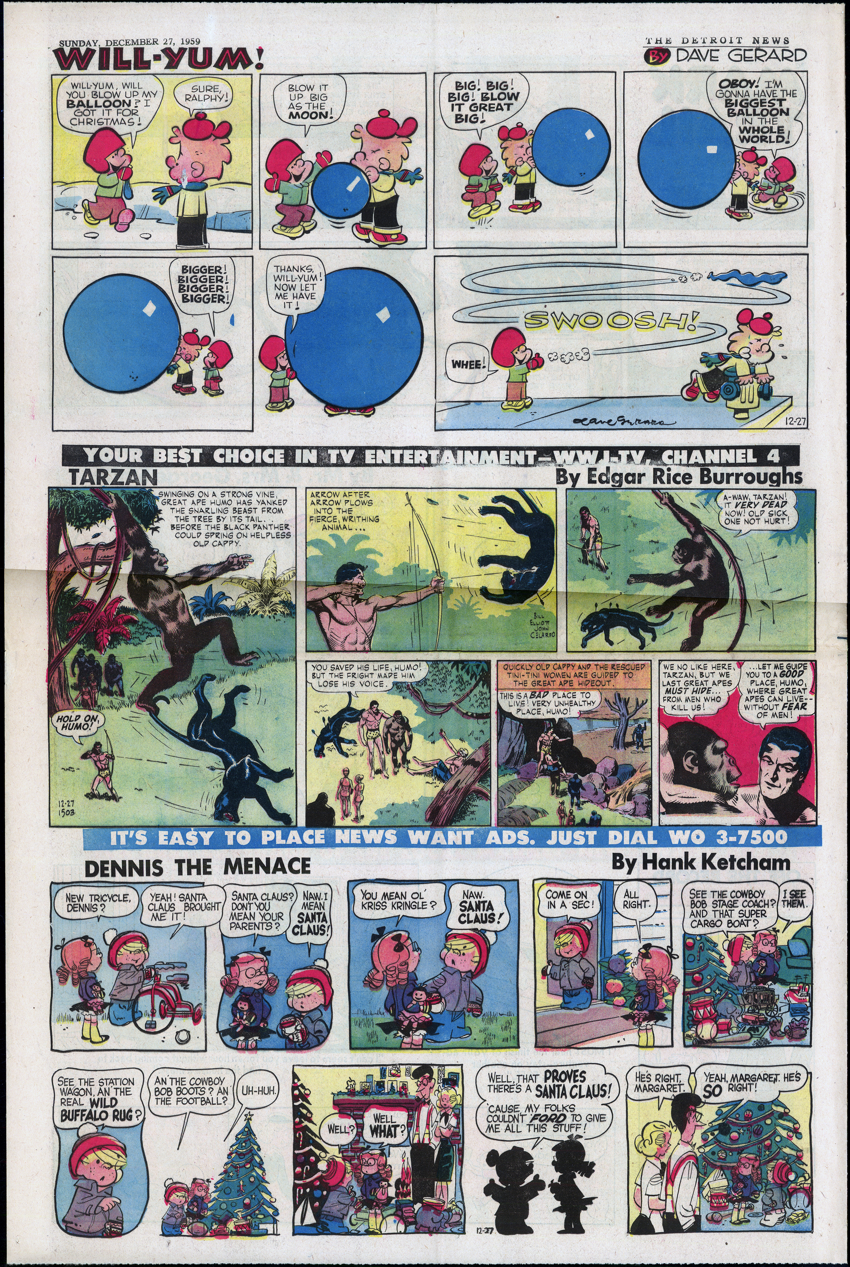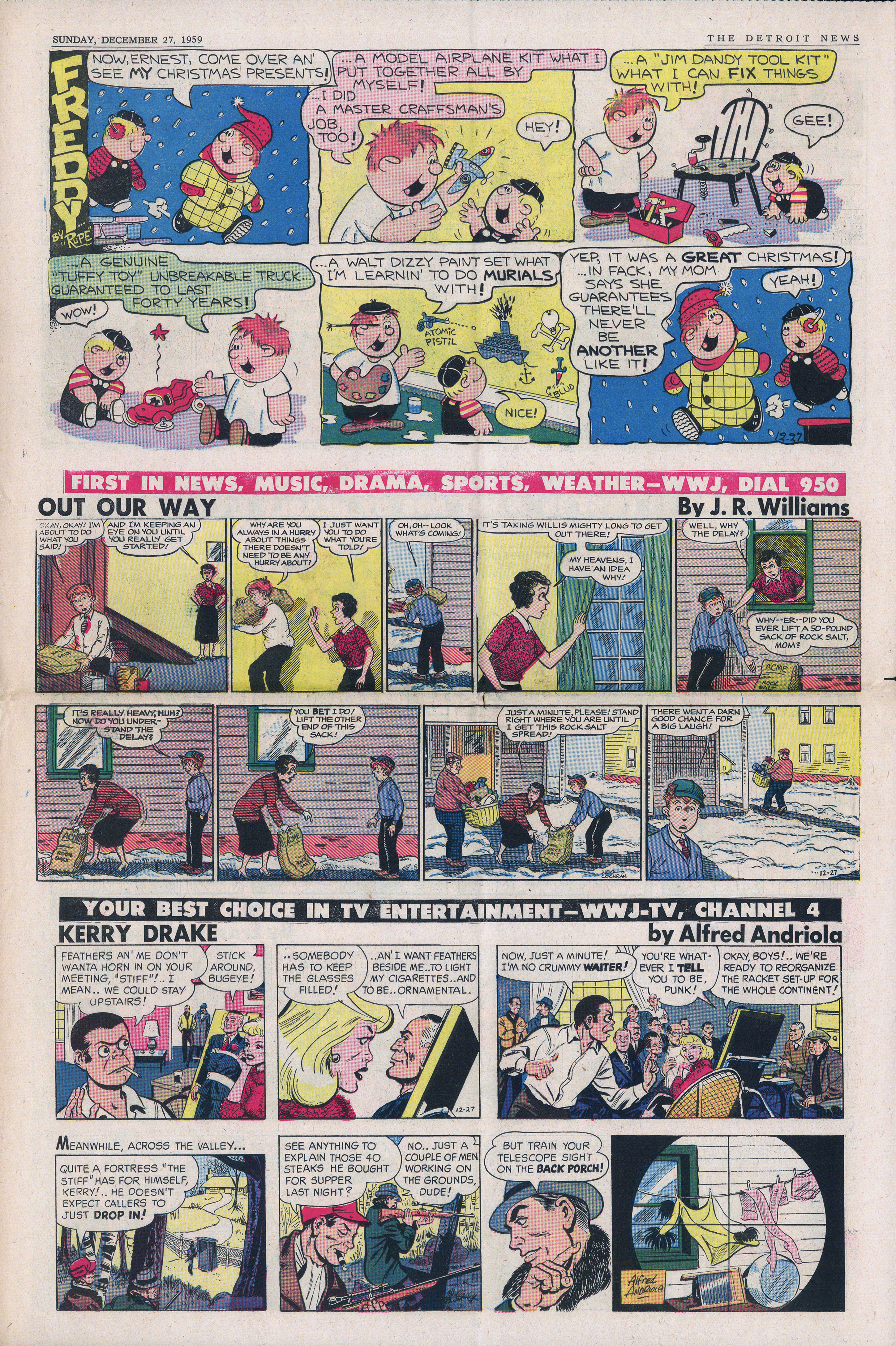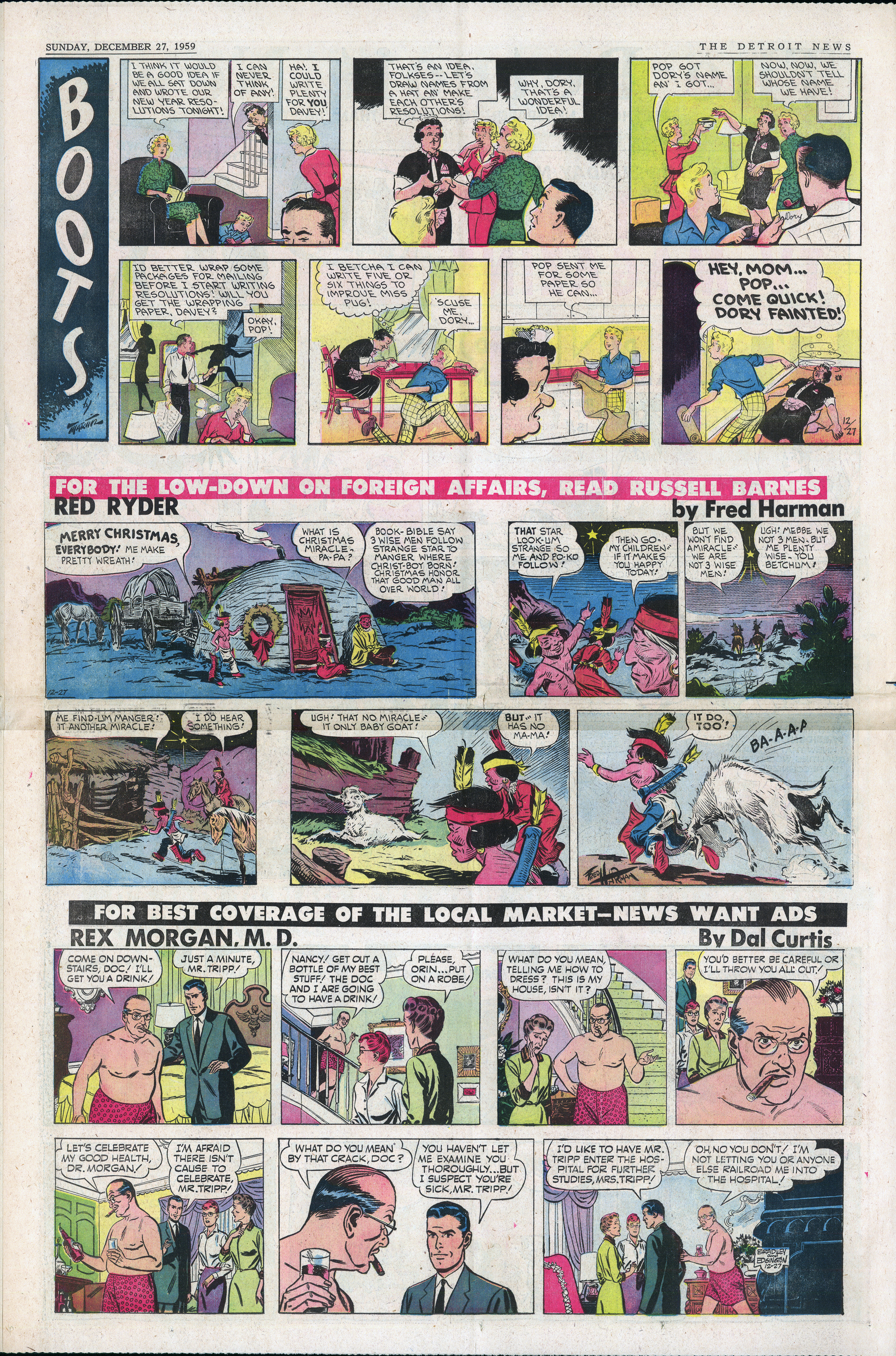One example of an intact section is the Sunday, December 27 edition of the Detroit News, from 1959. Despite being almost 60 years old, nearly all the comics appeared as one-third pagers. The only comic appearing as a half page is Al Capp’s “Li’l Abner.” Unfortunately, due to the size of the News’ masthead, Capp’s comic is pushed down onto the fold, making it more difficult to scan. (Sorry about the slight misalignment of the the comic’s two pieces).