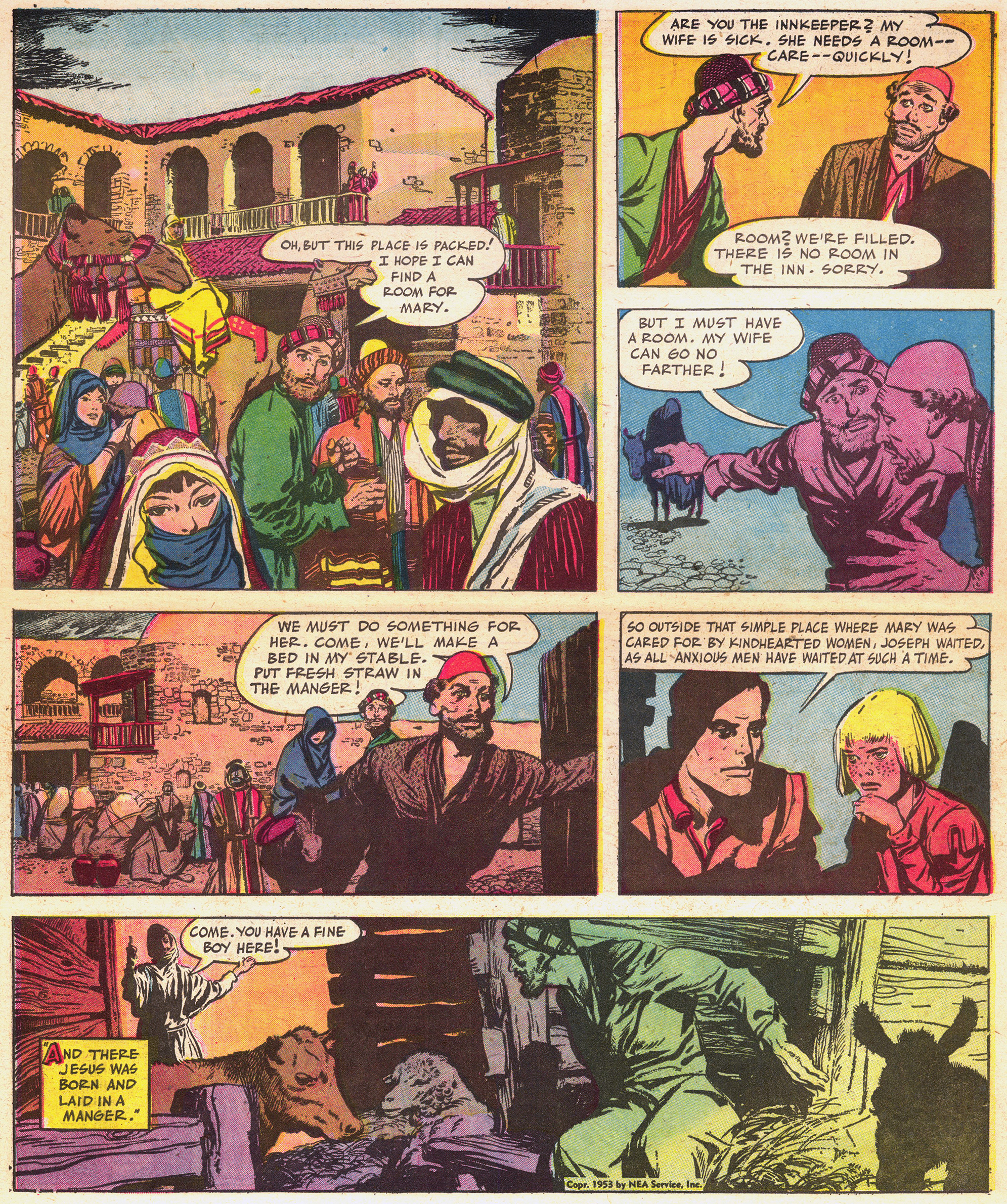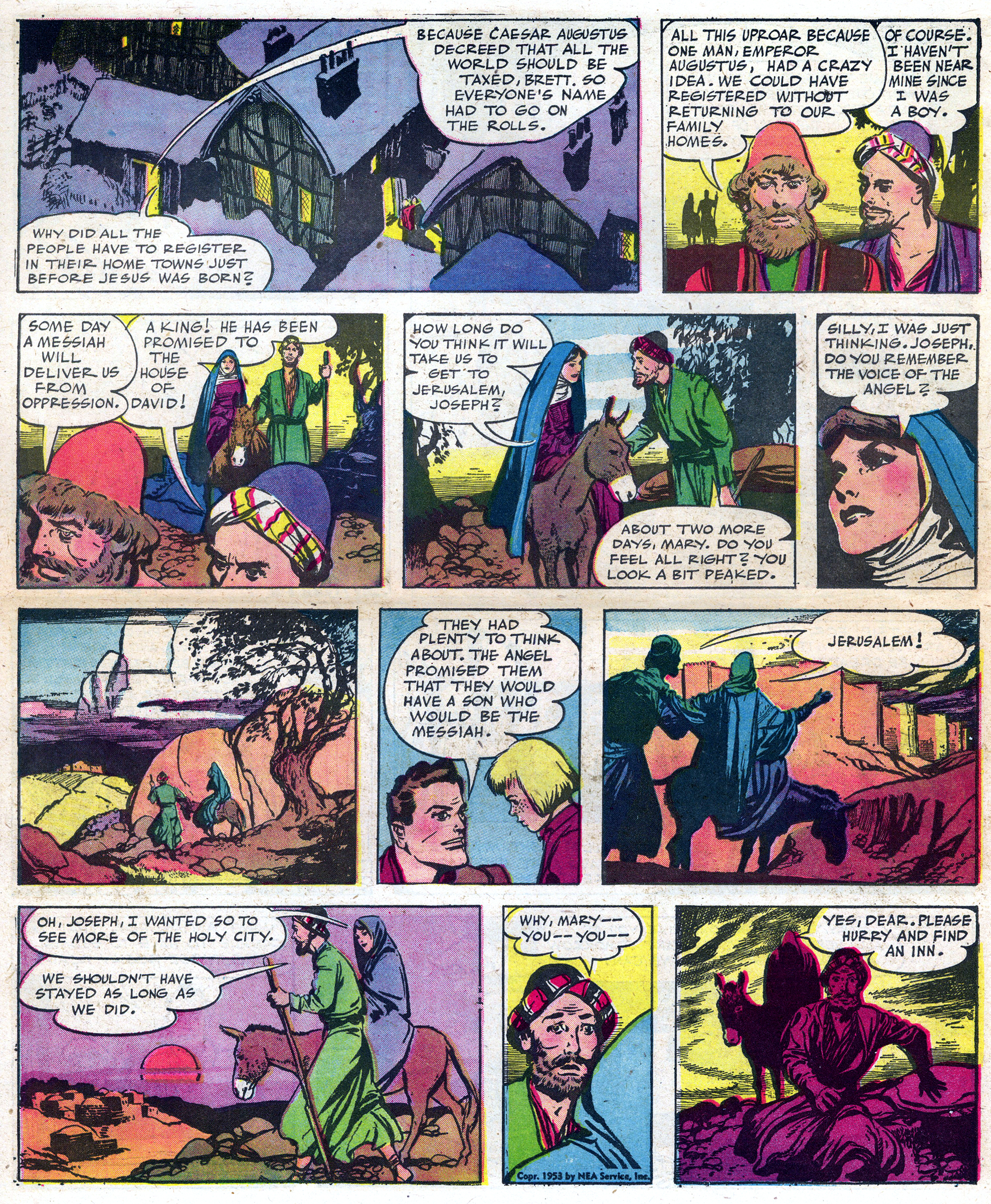 In 1949, Collins used his “Mitzi McCoy” comic strip as a vehicle to tell the Christmas Story. Although some panels showed Stub Goodman narrating the story to a young boy (Dick Dixon), most of the visuals consisted of the Christmas Story itself—Stub and Dick generally only appeared once or twice in each episode. Those comics appeared last year on this blog and can be seen here.