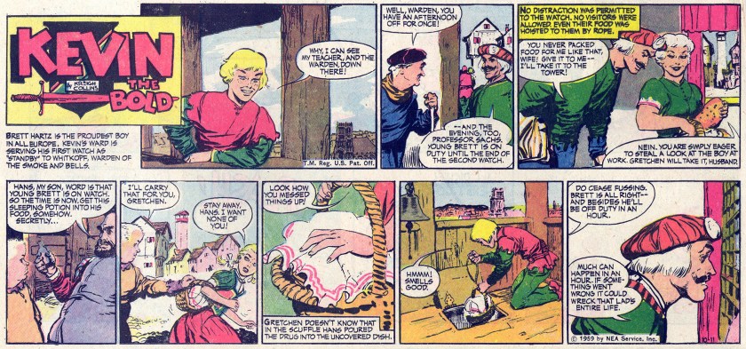 …but arson is another. Interestingly, the panel showing Hans running from the fire he had set was the throwaway panel, so this detail would be lost on tabloid or third-page readers. The panel that follows, where Hans’ father asks if the deed is done, leaves the fire’s origin as somewhat ambiguous.