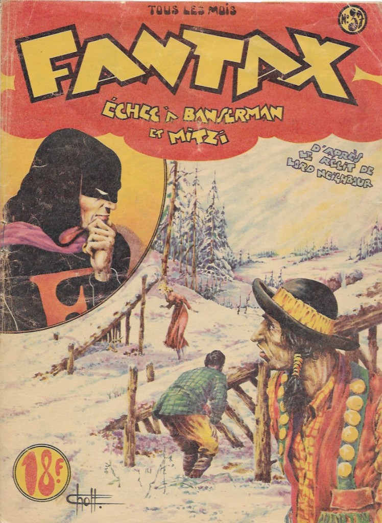 I learned that “Mitzi” first appeared in issues of Fantax (35-39), then in Big Bill le Casseur (32-51), Robin des Bois (28-32), and finally P’tit Gars (1). For issues of Fantax, Chott created covers featuring characters and events from the episodes inside. Fantax was a superhero character Chott created in 1946, but for several issues, he shared the front covers with Mitzi McCoy.