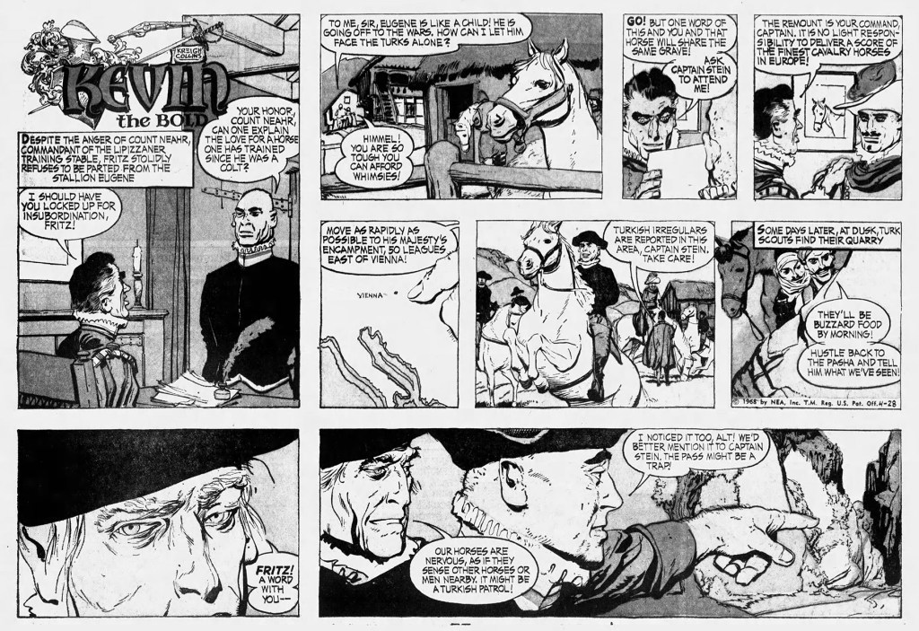The following story arc ran in mid-1968 and was “Kevin the Bold” ’s penultimate sequence, appearing just before the strip morphed into “Up Anchor!” It ran over the course of 18 weeks and seems to have been deliberately included as sort of a grand finale—its subject matter was something very close to Collins’ heart. I don’t have original examples of five of the episodes, including the first four, but I do have color half pages of most of them, so stick around.
