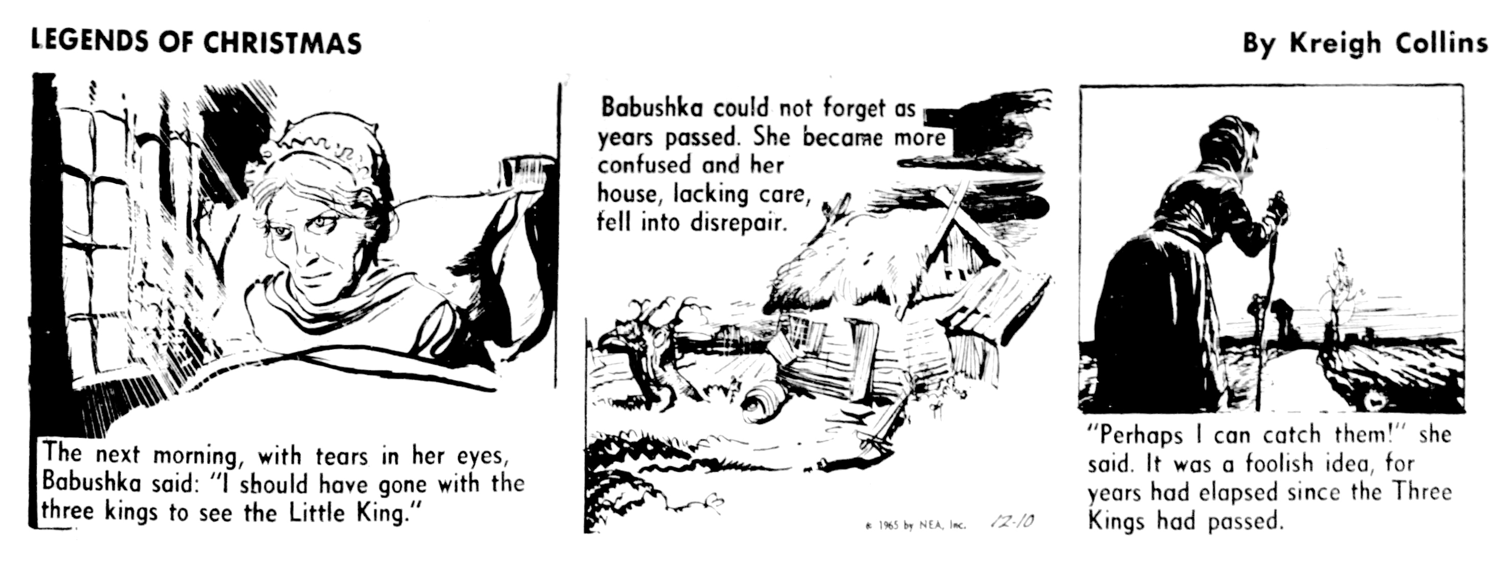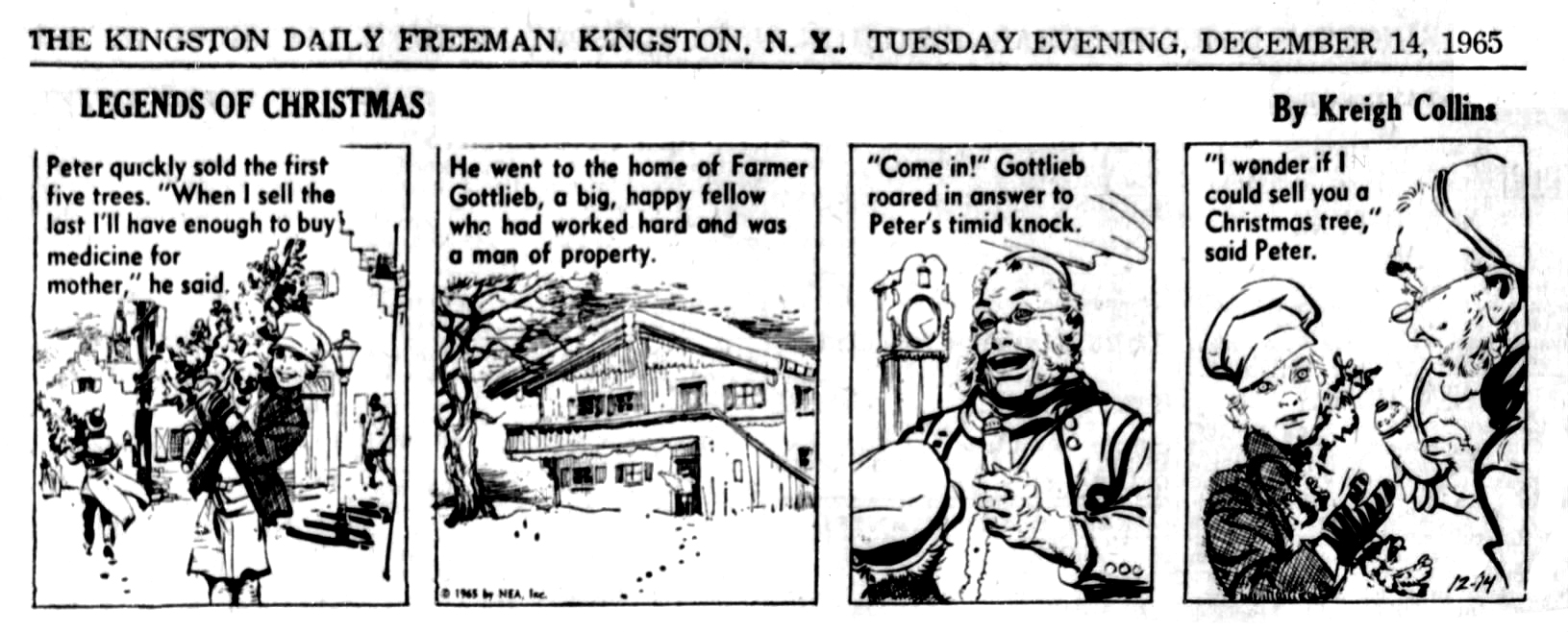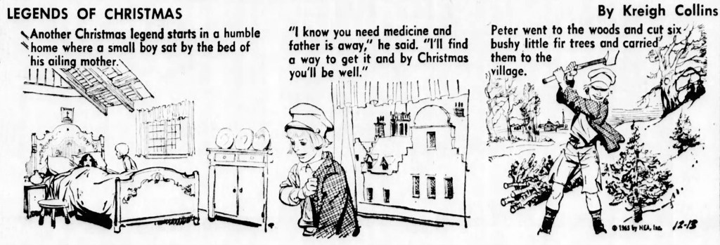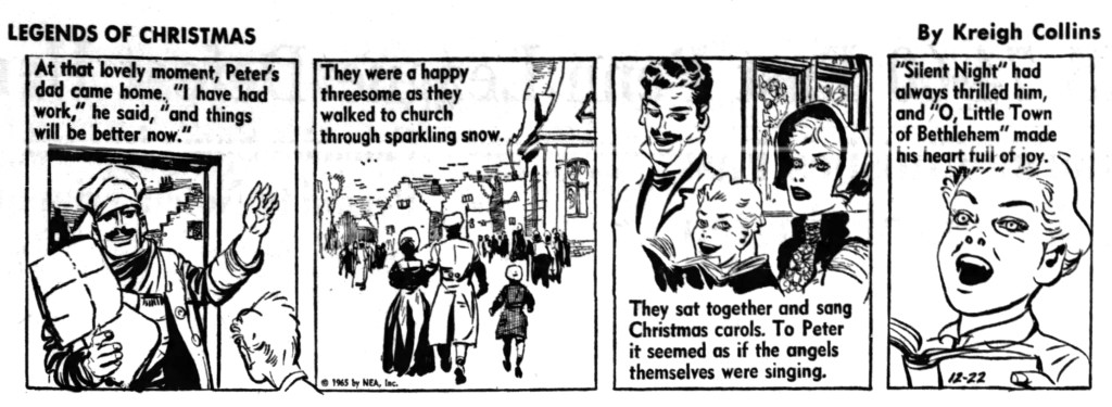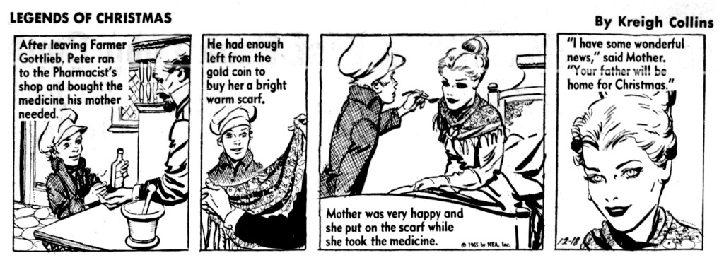 Starting in 1936, Kreigh Collins’ syndicate, NEA, produced special Christmas strips. A complete list of the titles and artists can be found here. In 1965, Collins’ creation “Legends of Christmas” was featured.