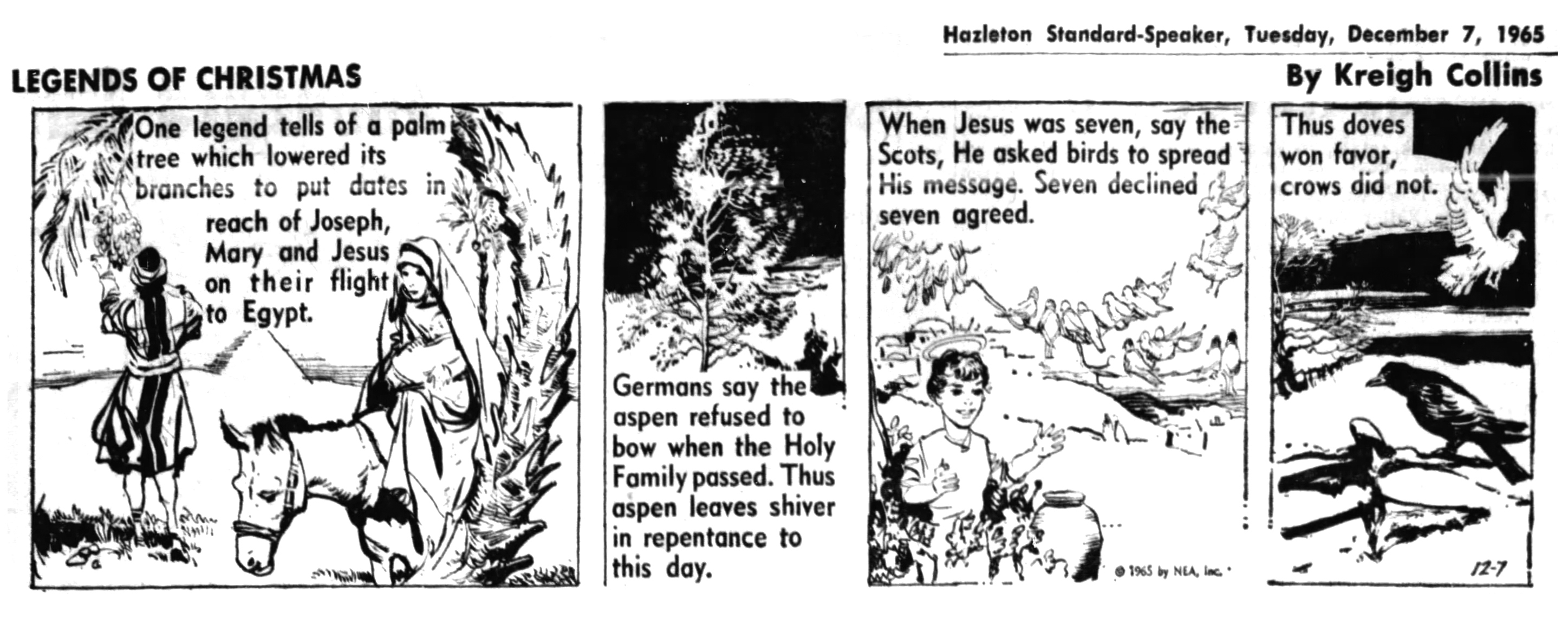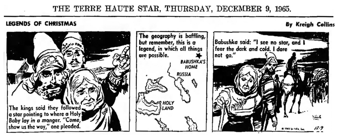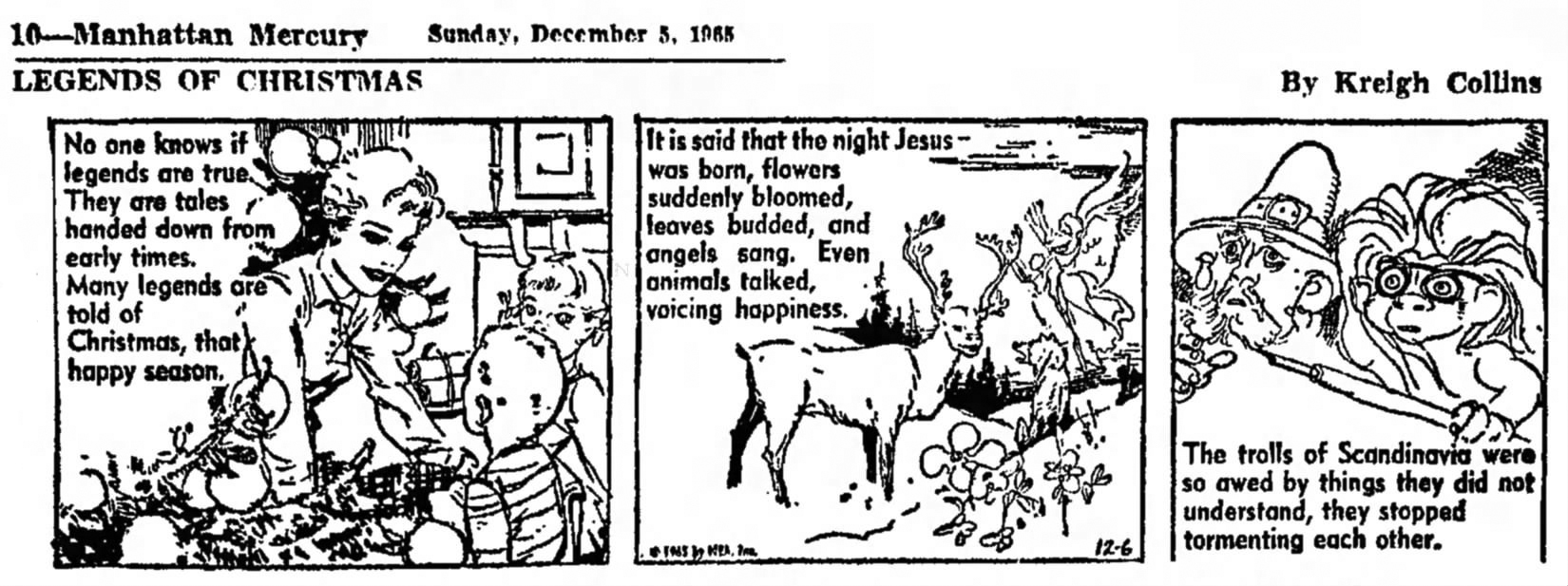 Starting in 1936, Kreigh Collins’ syndicate, NEA, produced special Christmas strips. A complete list of the titles and artists can be found here. In 1965, Collins’ creation “Legends of Christmas” was featured.