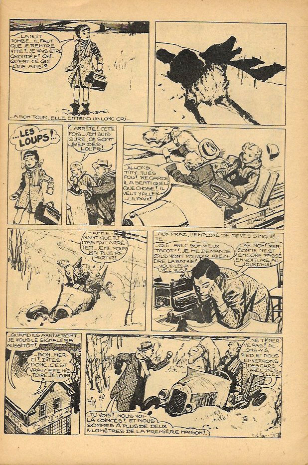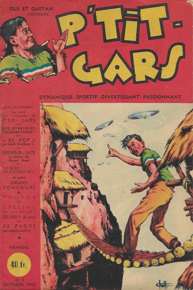 “Mitzi McCoy” was featured in several of Pierre Mouchot‘s French comic book titles, and P’tit Gars No. 1 was her swan song. This issue featured the eighth chapter in Mitzi’s saga, titled “L’exploit de Tiny” (or “Tiny’s feat”).