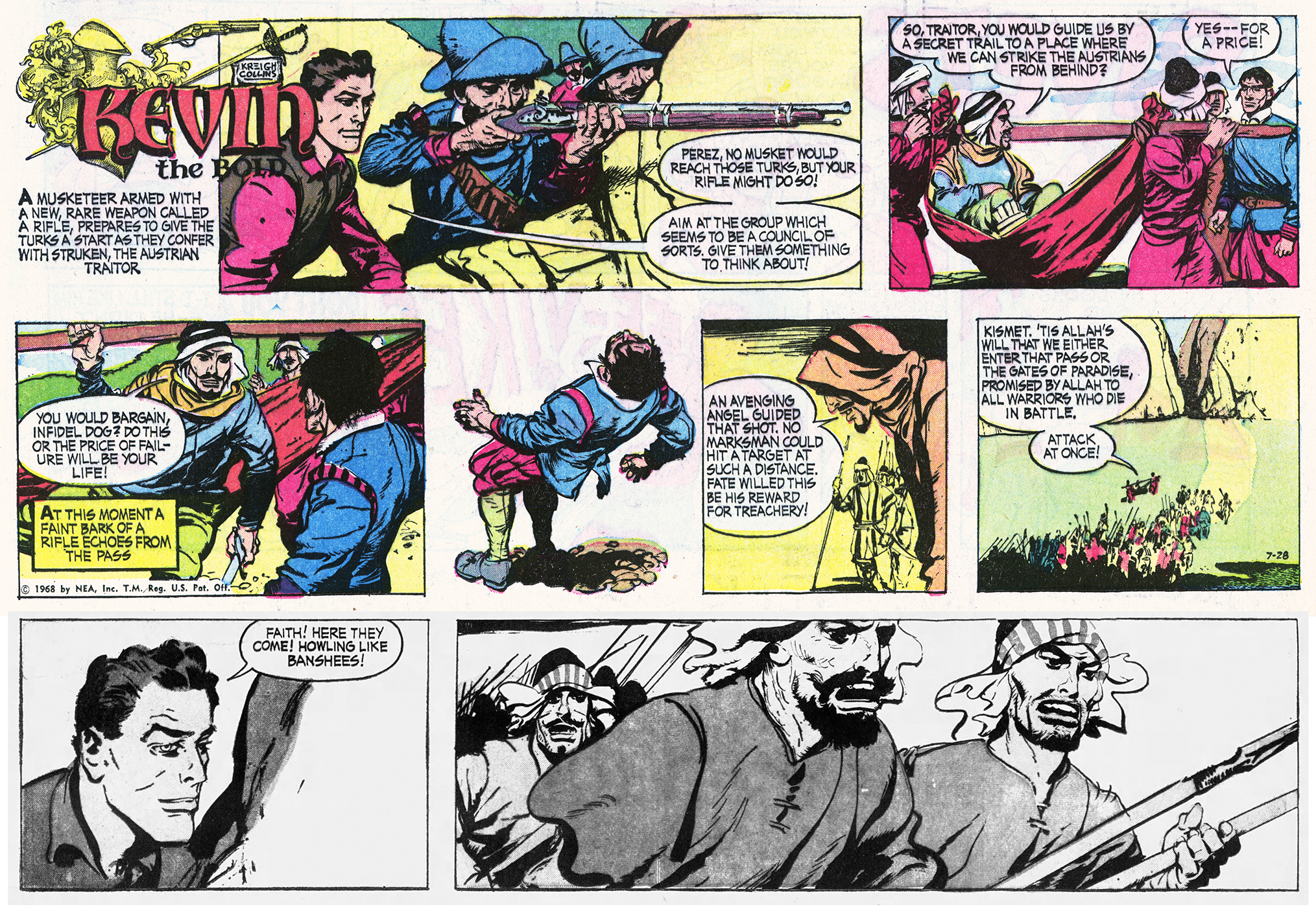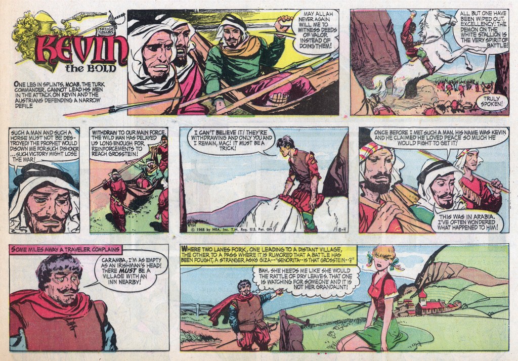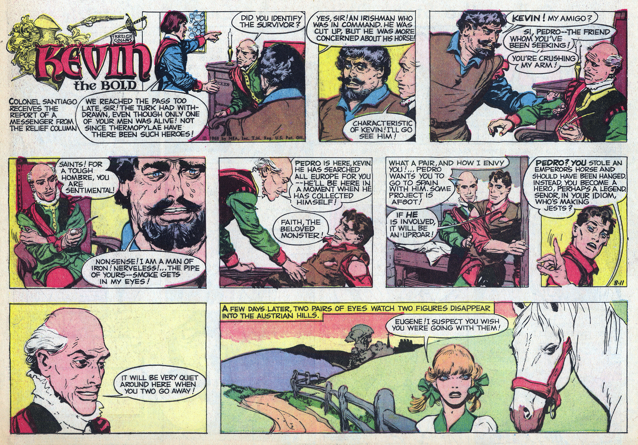 Although it never ran in newspapers as part of the usual NEA fare, the Christmas story was reprised in 1953, in a special offering under the guise of a “Kevin the Bold” narrative. This time, most of the artwork from the “Mitzi McCoy” version was simply picked up and reused, with panels that showed Mitzi‘s characters (Stub Goodman was shown explaining things to his young friend Dick Dixon once or twice in each episode) being replaced by similar ones featuring Kevin and his ward, Brett.