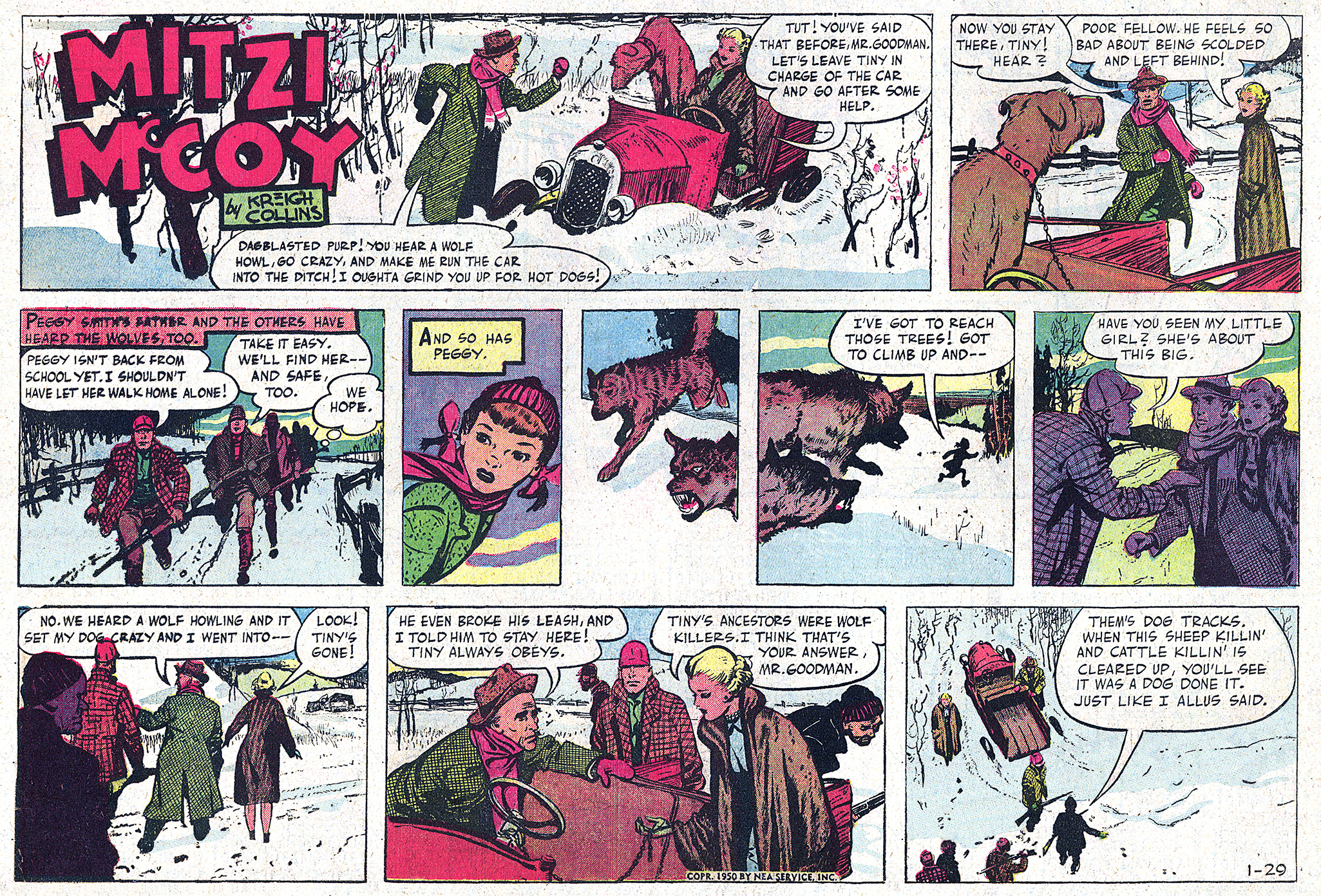 The artwork for the final page of the story comes from at least two episodes: February 12, 1950 (panels 1–2) and February 19, 1950 (panels 4–6). The third panel is another that I could not find in the original artwork).