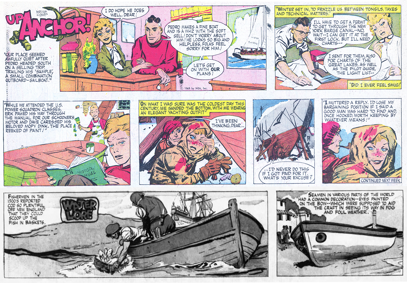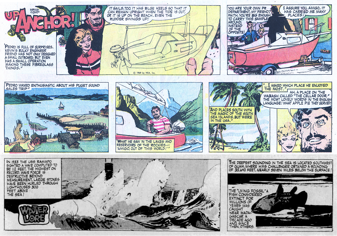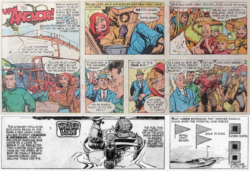 While the photo above shows skipper Collins 10 years after he purchased his schooner, the “Up Anchor!” chapter starting today was just the second one in the strip’s 3.5-year run. It starts with Pedro showing off a small fiberglass boat he’s peddling, which must have appealed to Kreigh — maintaining a 40-year-old, wooden 40-footer required quite a bit of elbow grease! No doubt the Collinses worked up a sweat, even in chilly spring weather.