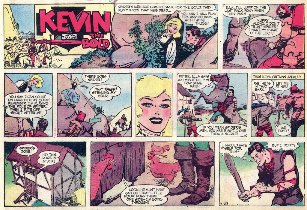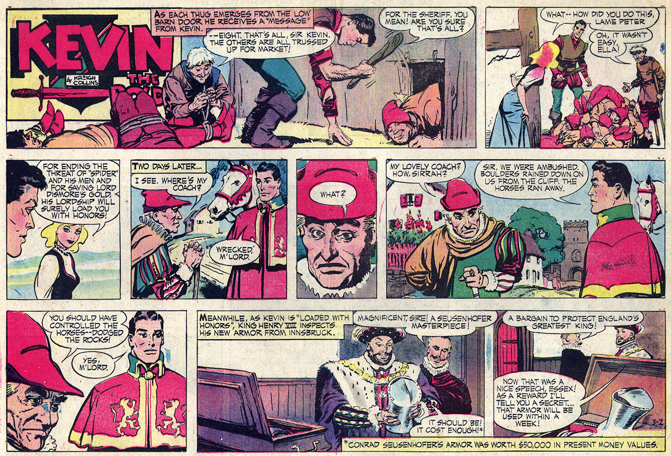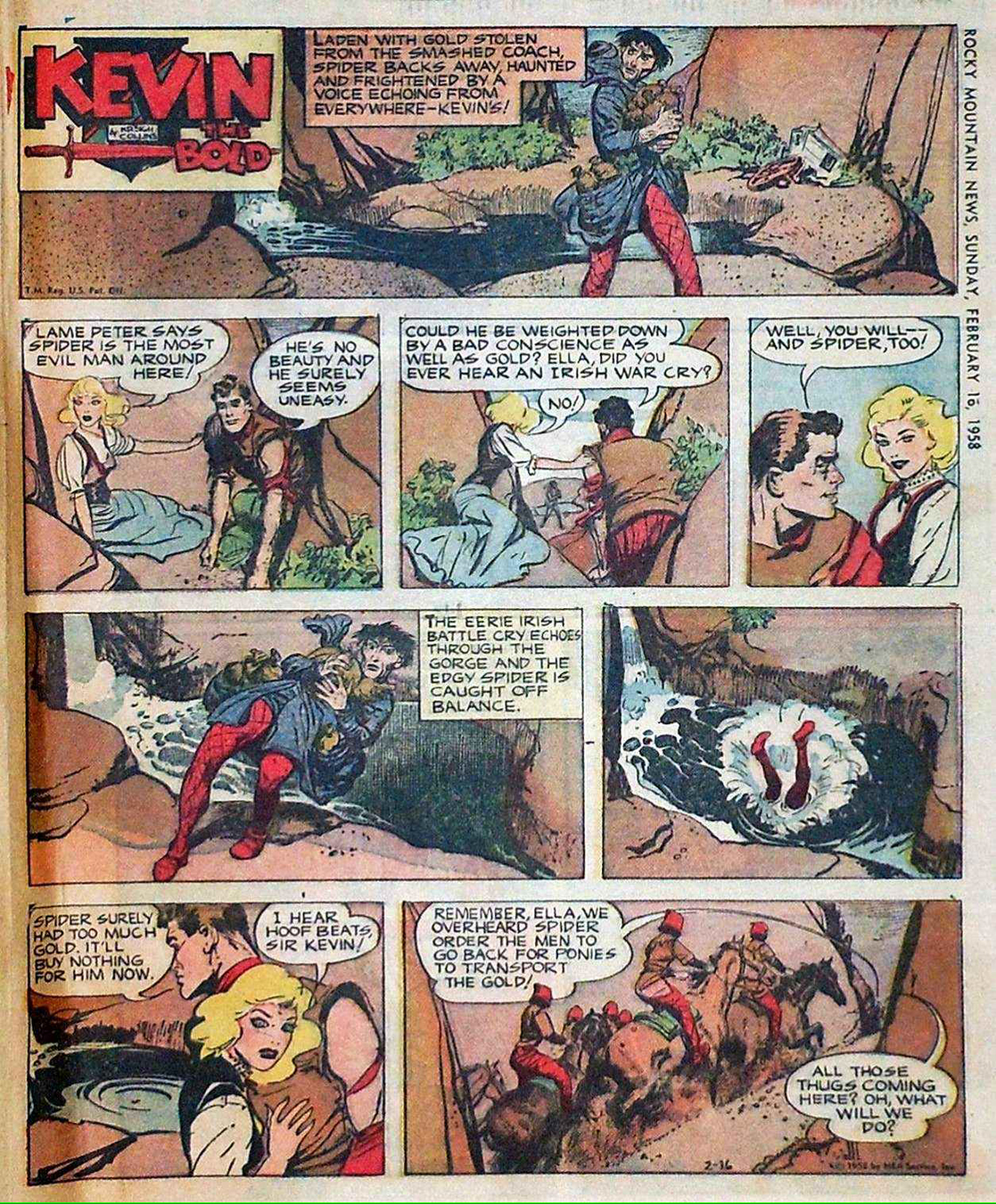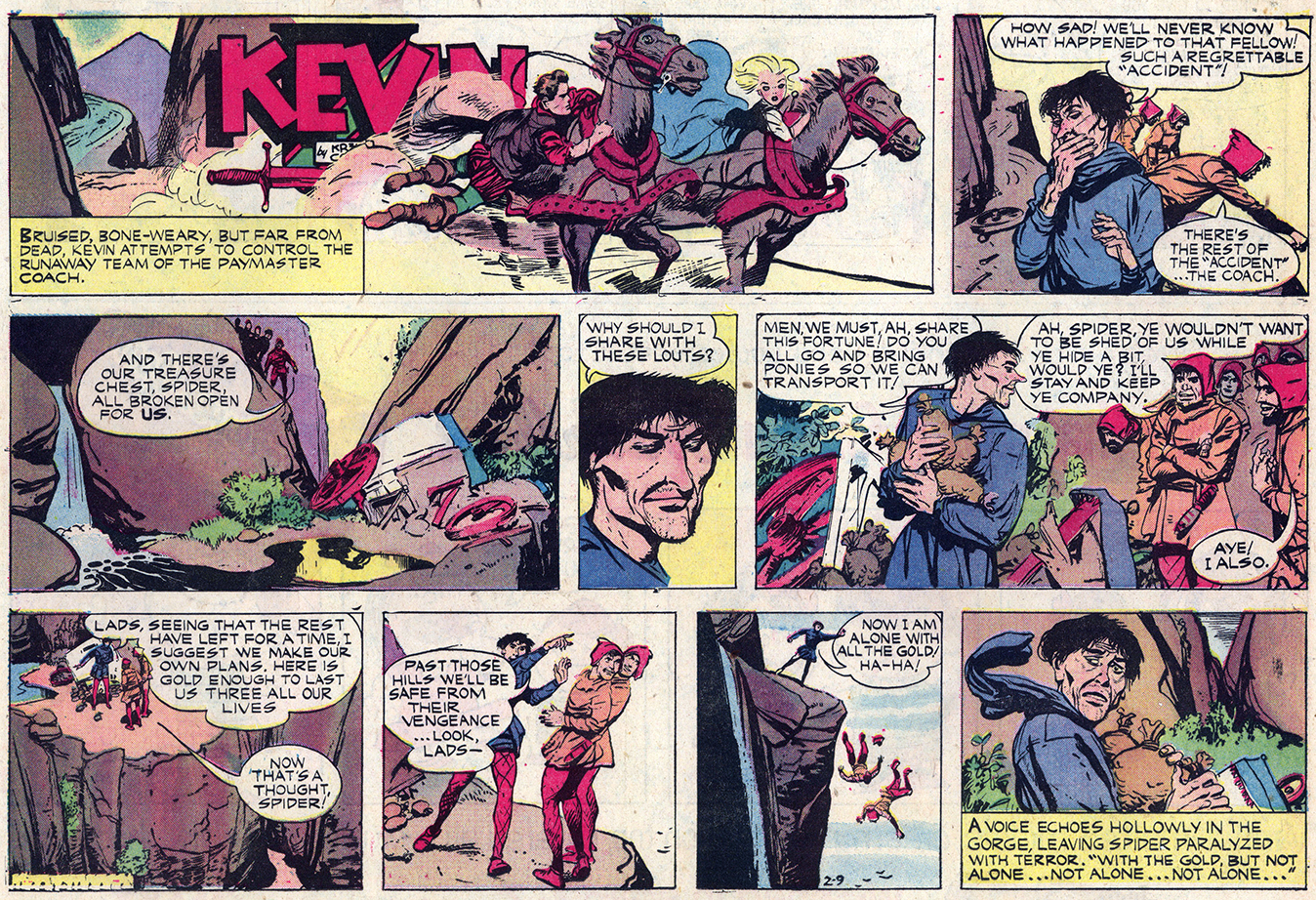 Kevin’s keening war cry, busted out only on rare occasions (such as on Sunday, October 24, 1954), startles Spider. Encumbered by gold, he sinks like a stone, much like Sir Guy Thornberry (in an episode from 1956).