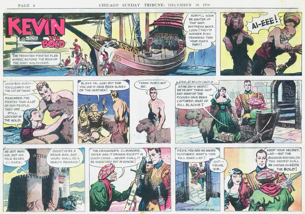 Very interesting that the action in ROLAND begins with the third KEVIN THE BOLD episode. The first two episodes focus on the meeting between Moya McCoy and Kevin, which is significant when considering the bridge between the comic features MITZI McCOY and KEVIN THE BOLD. But for a comic book featuring Kevin, the original meeting itself isn’t so important, and with this framing, Moya becomes more of a supporting character, and less of a protagonist, as Mitzi McCoy’s ancestor.