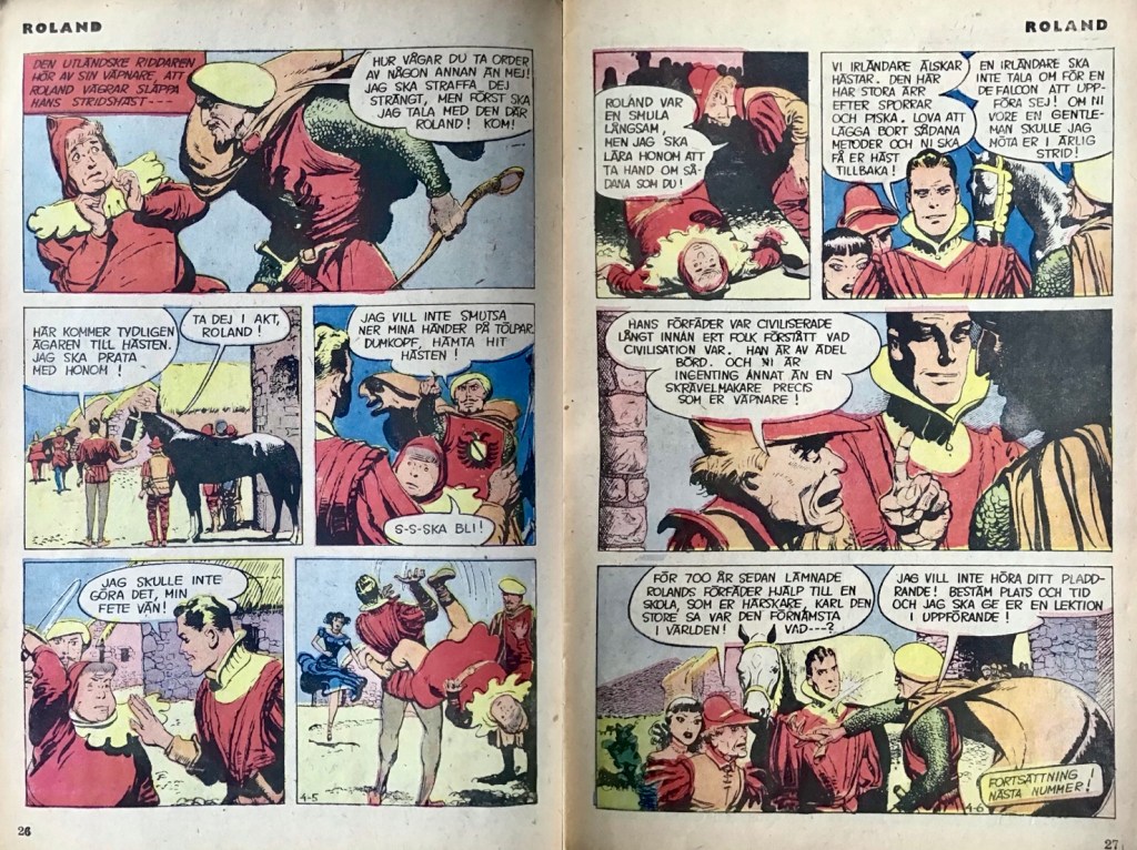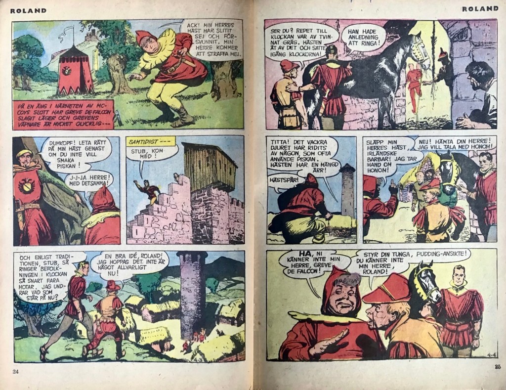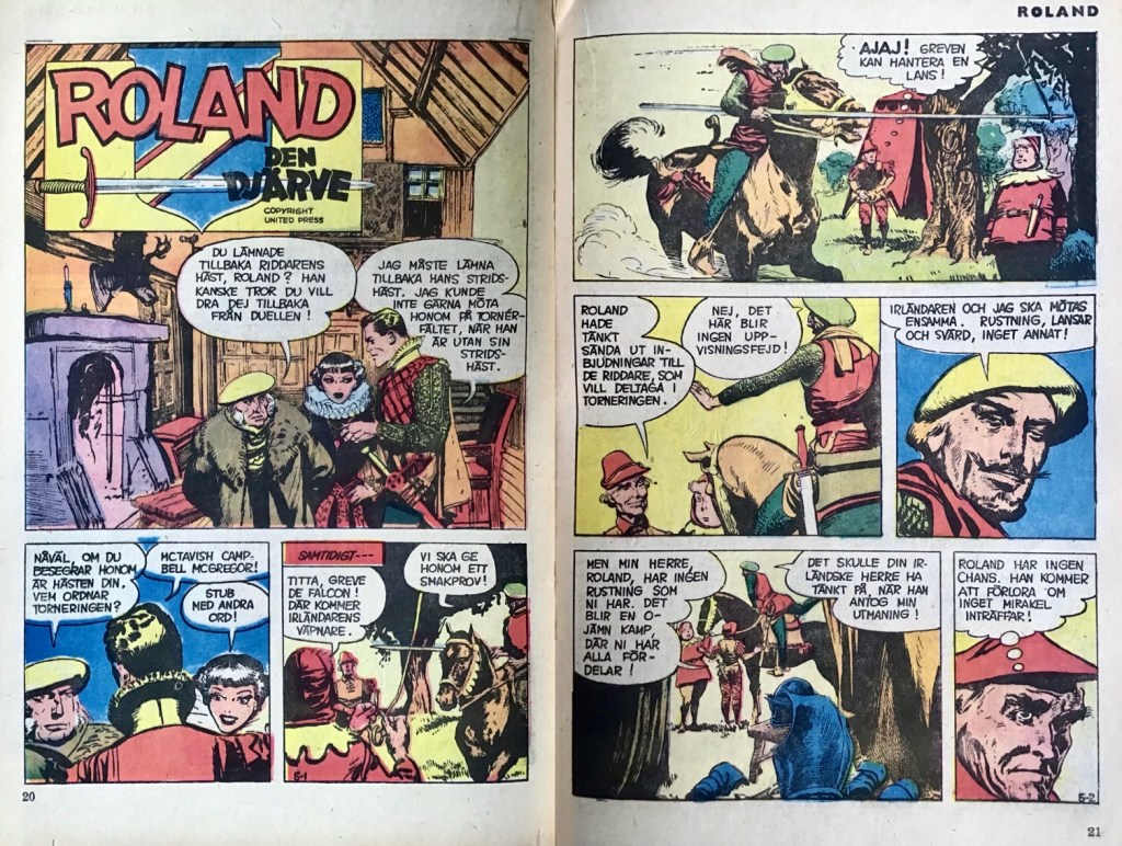 This incarnation, retitled ROLAND DEN Djärve, initially ran in full color, with three or four original episodes spread across six or seven pages. As was the case in some of KEVIN’s other comic book appearances, the panels’ sequence could be changed, and sometimes panels (other than the throwaways) were eliminated. These edits were necessary to squeeze the art into the smaller confines of the comic books’ pages. Additionally, the color schemes could change compared to he original Sunday versions, and panels originally rendered in a two- or three-color scheme now appeared in full color throughout.