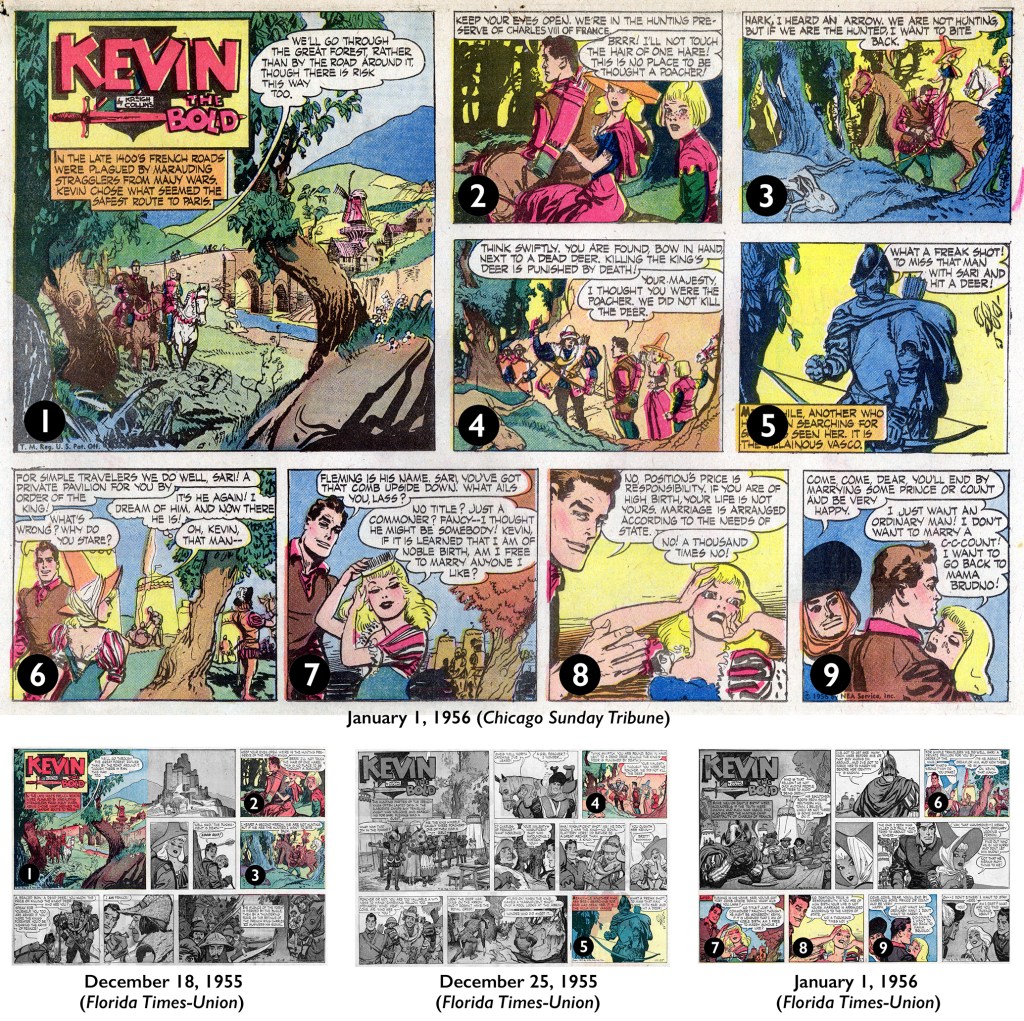 Meanwhile, with Christmas over, the Tribune found room to resume running KEVIN THE BOLD half-page episodes. But in comparing its January 1 episode with that from the Times-Union, a discerning observer (shout out to my friend Dale!) would quickly notice the difference between the two.