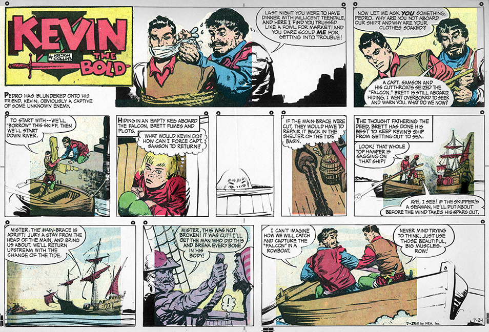 Unfortunately, my third page episode for July 24 was torn and taped together, discoloring the page in a couple spots. And perhaps the third pages mesh better with black and white half pages better than with black and white bromides. Meanwhile, in the episode above, what Brett had done to sabotage the Falcon wasn’t exactly clear. Quick checks on the definitions of top hamper and main brace were helpful—Brett cut the line holding the ship’s uppermost rigging in place, causing a mess. (I wonder how many comic strips inspire readers to look up definitions? Some people might find it tedious, but I love the educational aspect of KEVIN THE BOLD).