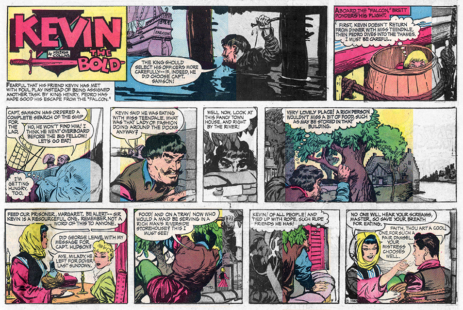 Unfortunately, my third page episode for July 24 was torn and taped together, discoloring the page in a couple spots. And perhaps the third pages mesh better with black and white half pages better than with black and white bromides. Meanwhile, in the episode above, what Brett had done to sabotage the Falcon wasn’t exactly clear. Quick checks on the definitions of top hamper and main brace were helpful—Brett cut the line holding the ship’s uppermost rigging in place, causing a mess. (I wonder how many comic strips inspire readers to look up definitions? Some people might find it tedious, but I love the educational aspect of KEVIN THE BOLD).