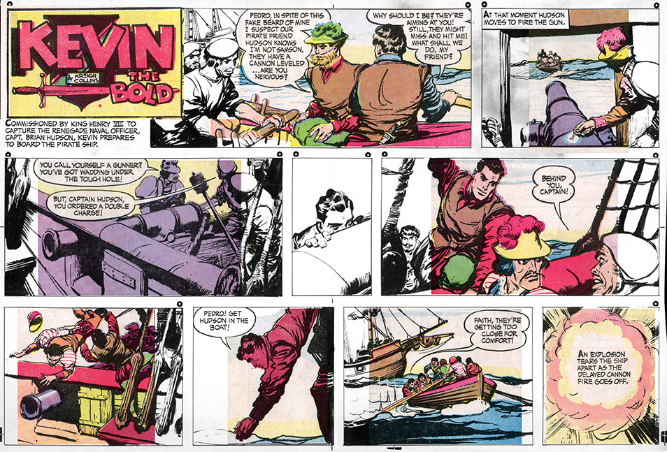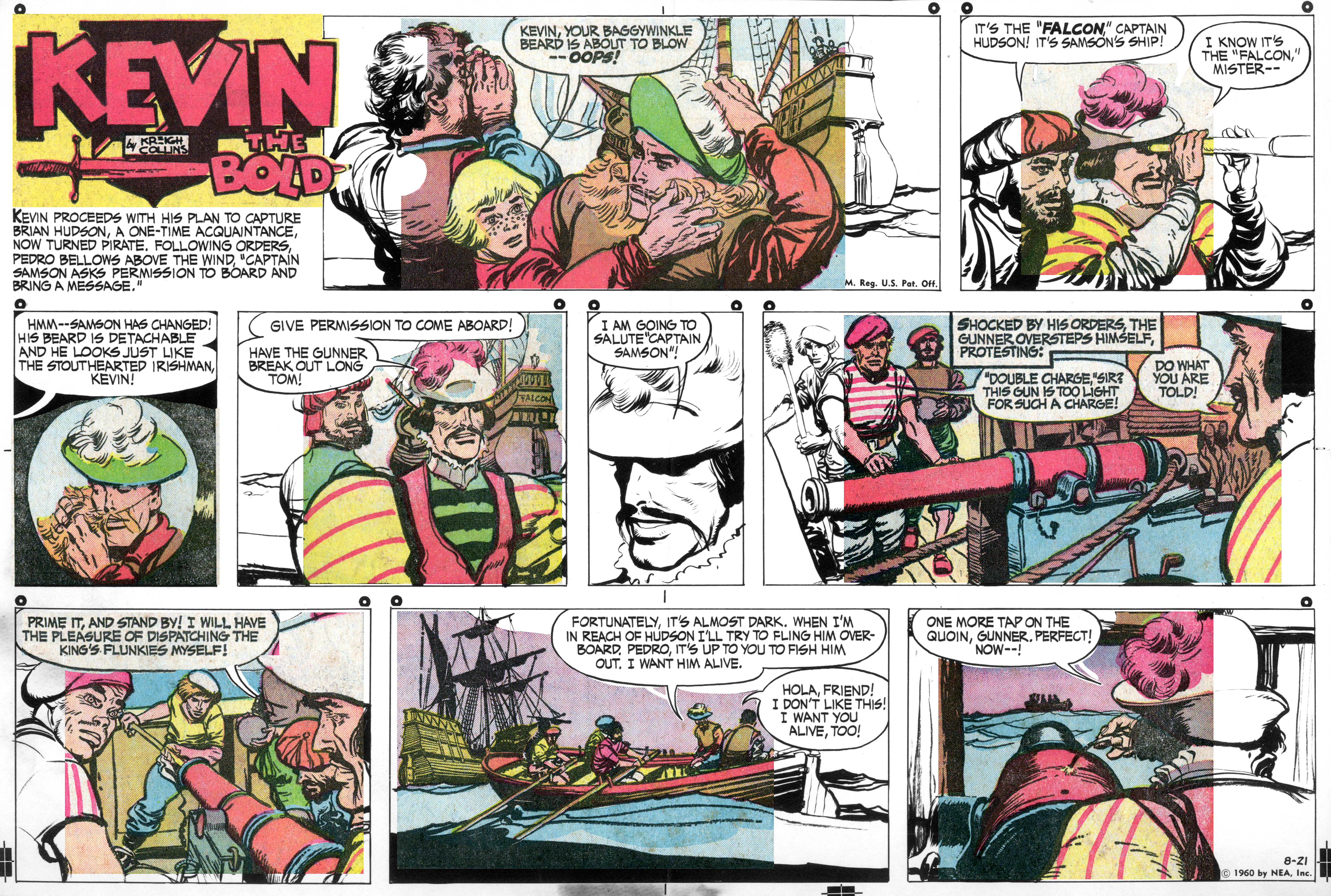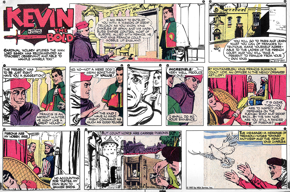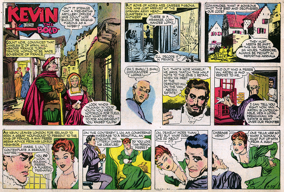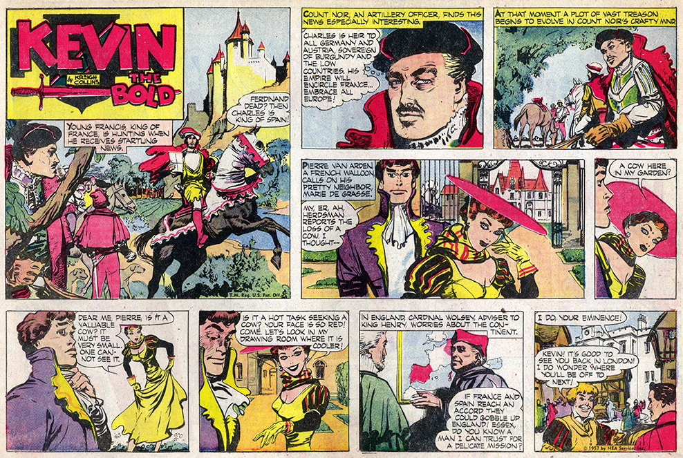 Next week, a new story arc begins. It features the villain Count Noir, and ran in the funnies in the summer of 1957. The story arc picks up where the action in “Kevin the Bold: Sunday Adventures” leaves off. “Sunday Adventures” is a collection of nearly three years’ worth of episodes, presented in a black and white tabloid format, from original proofs (for all but a few episodes). Available here.
