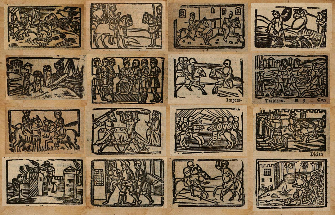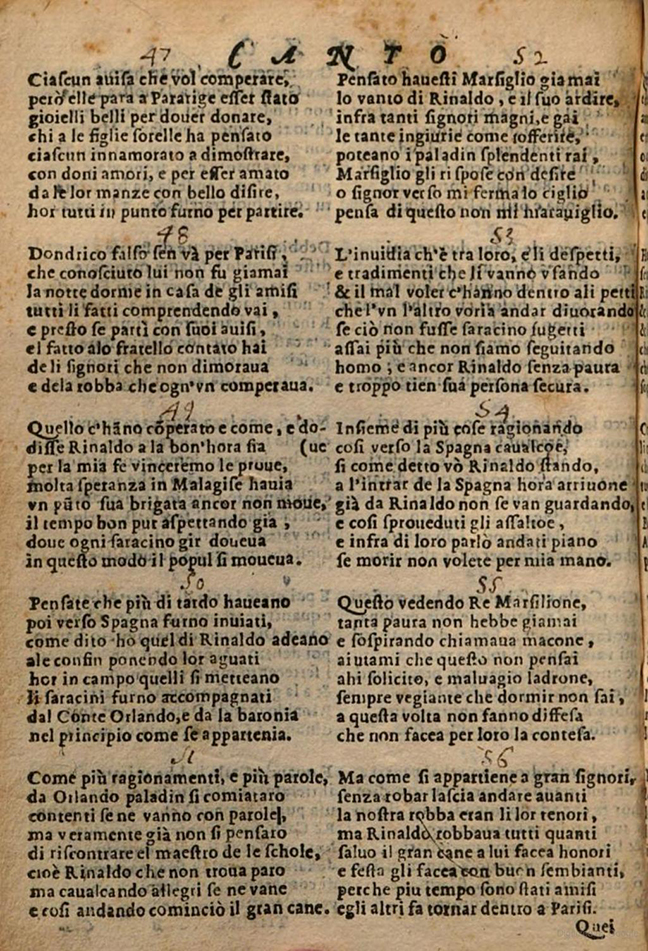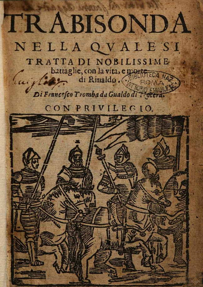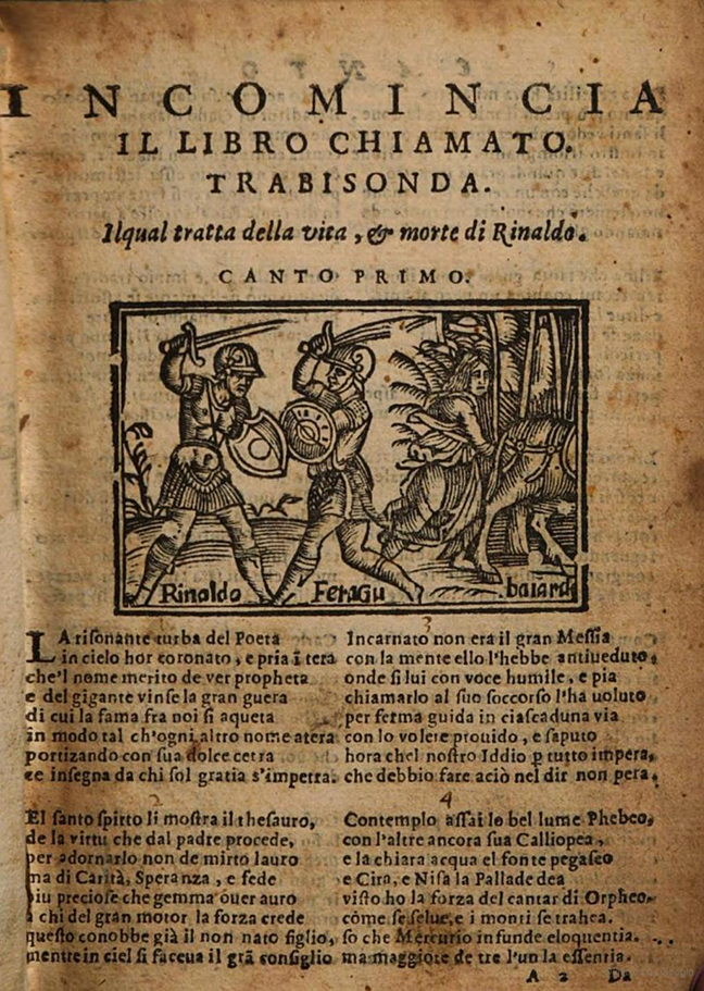 The book, nearly 300 pages long, consists of a single poem, written in over 2,000 eight-line stanzas. The first page of the book has a large woodcut illustration showing two armored men battling, helpfully including identifications of the combatants—one of whom is named Rinaldo.