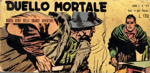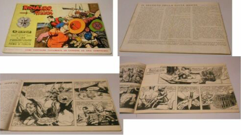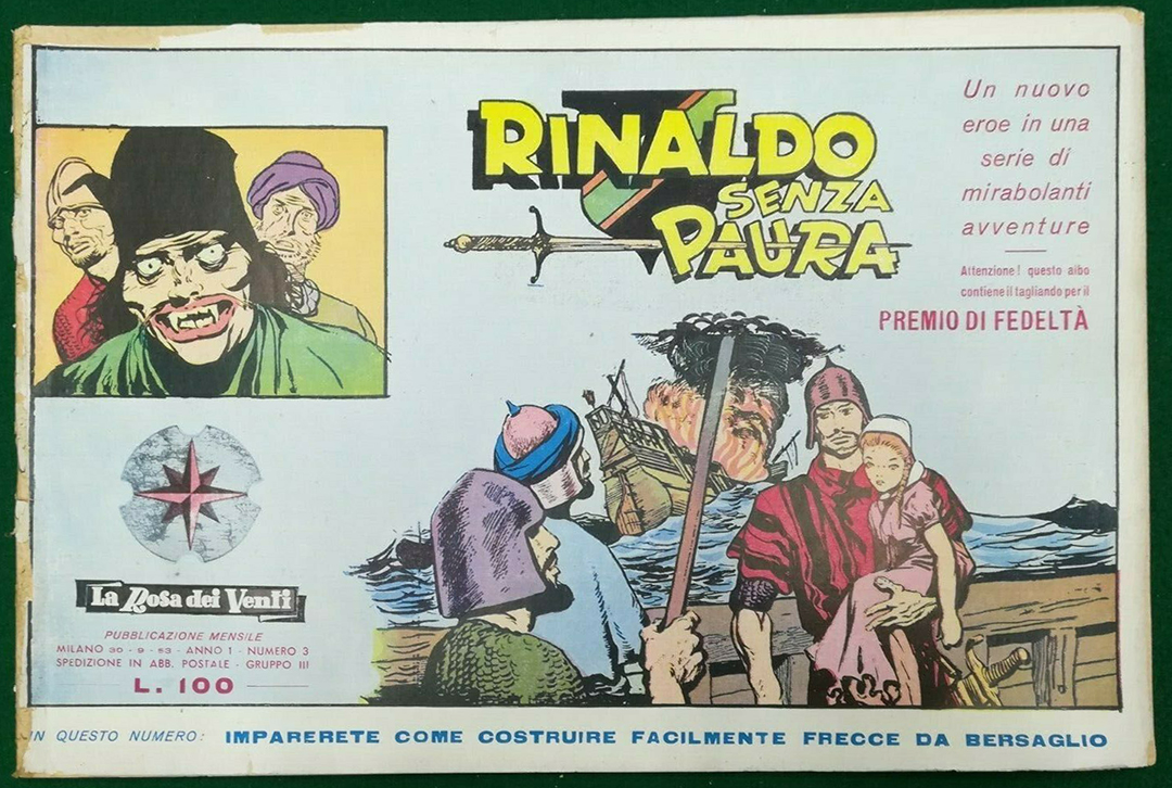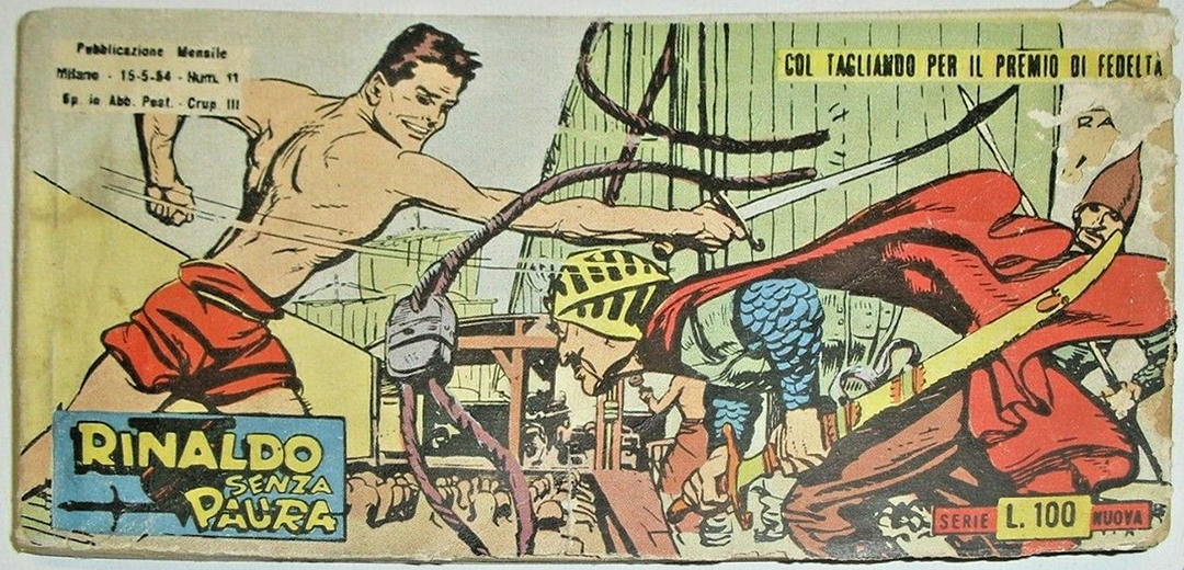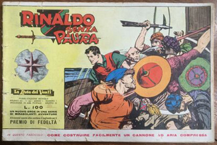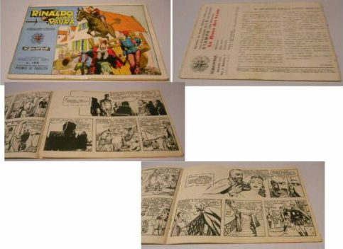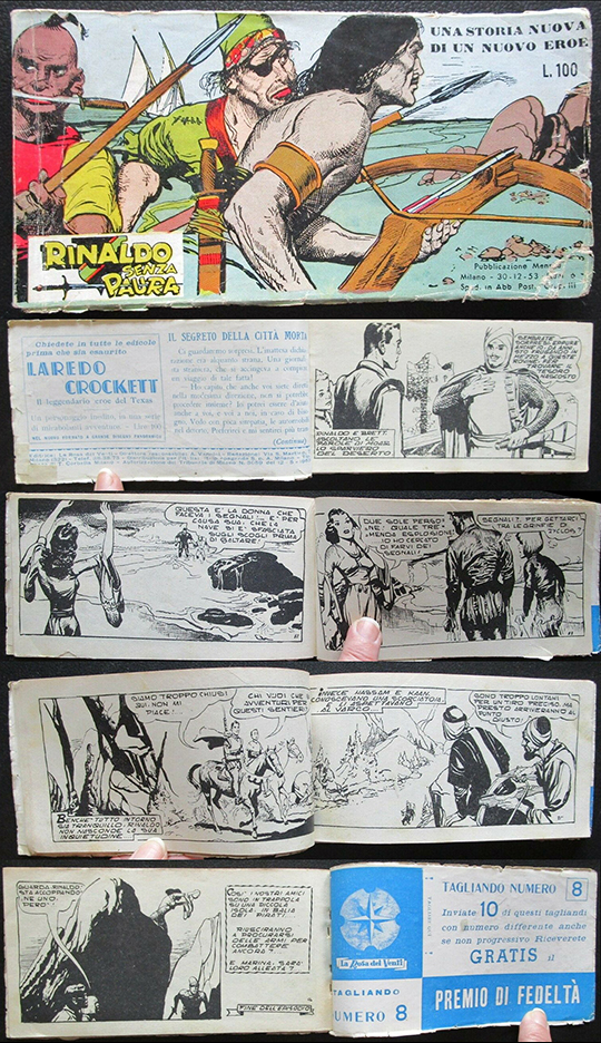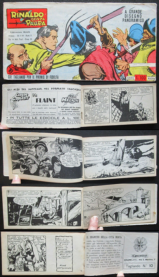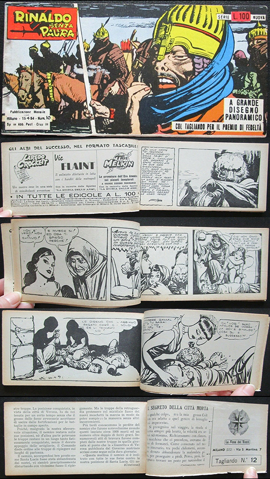 The comic books must be rare—the ones listed on ebay are quite expensive. According to the publishing information Davide sent, 14 editions were published by La Rosa dei Venti, based in Milano, dating from 1953–54. Printed in a horizontal format, the comic books were initially 24.5 cm x 17 cm (9.6″ x 6.7″) and 32 pages long; after four or five issues the trim size was reduced to 17 cm x 8 cm (9.6″ x 3.1″) and ran 96 pages. Here are some of the larger-format issues: