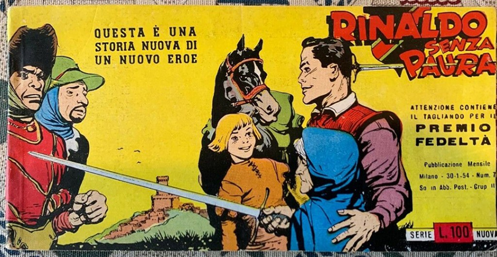 Aware that KEVIN THE BOLD had been published as part of the 1970s Italian comic book “Il Nerbiniano,” I recently learned that Kevin was originally featured in his own line of comic books under the moniker RINALDO SENZA PAURA. It’s a great name for our hero, since Rinaldo means “wise power” or “ruler’s advisor,” and senza paura translates to “fearless.” (A huge grazie to my friend Davide for alerting me to these Italian editions!)