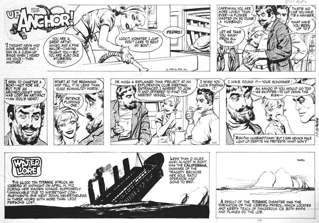 I don’t have very many UP ANCHOR! newspaper examples, but the Grand Rapids Public Library has a large collection of original illustrations (nearly half of the 174 episodes), which I have photographed on my visits to the library. Sadly, my UP ANCHOR! photos didn’t turn out as well as those from previous visits, when I shot the library’s collection of MITZI McCOY and KEVIN THE BOLD originals. However, my friend Gregorio from Spain worked some photoshop magic on my lousy exposures; about a dozen of these images will appear here over the next several weeks (supplemented by a few color Sunday pages from my collection).