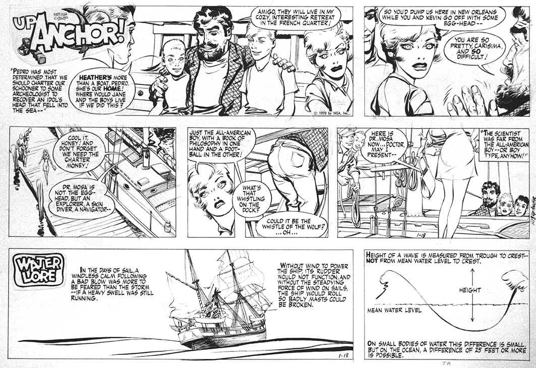 UP ANCHOR! was inspired by events my grandparents experienced aboard Heather, their 45-foot schooner. The strip was narrated from my grandmother’s point of view; Theresa helped write it. In October, 1959, Heather arrived in New Orleans with its four-person crew (which included my eight-year-old uncles), and the Big Easy is where the story begins for the Marlin family.