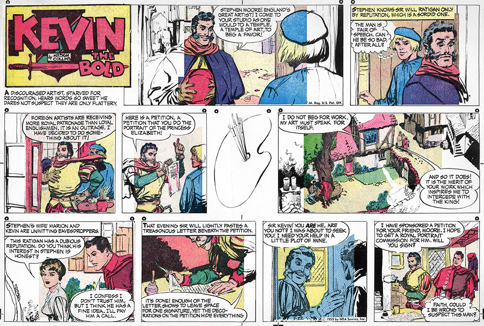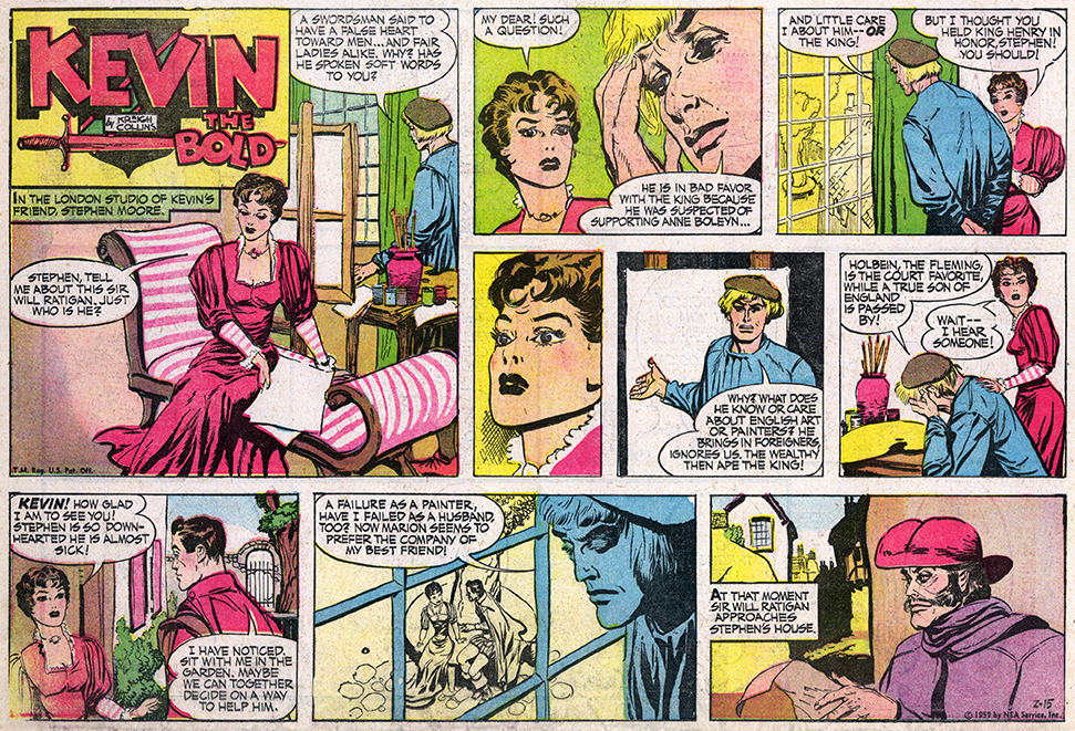 The following sequence, from early 1959, features a character named for one of Kreigh Collins’ friends. William Ratigan lived in Charlevoix, a town situated on an inland lake in northern Michigan that was a frequent port of call for Collins’ schooner Heather. Ratigan was was best known as the author of the book Great Lakes Shipwrecks and Survivals, published in 1960. In this chapter, Sir Will Ratigan is the villain in a plot against the monarchy of Henry VIII.
