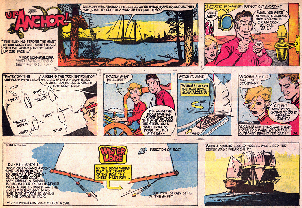 With summer here, it seems appropriate to feature a sequence from Kreigh Collins’ sailing-themed comic strip UP ANCHOR!. In this chapter, Kevin Marlin and his family are making plans for an extended journey south aboard Heather. Of the 19 episodes, only half are in color, but they will be supplemented in the coming weeks with some interesting articles on the real-life events that inspired the action in UP ANCHOR!.