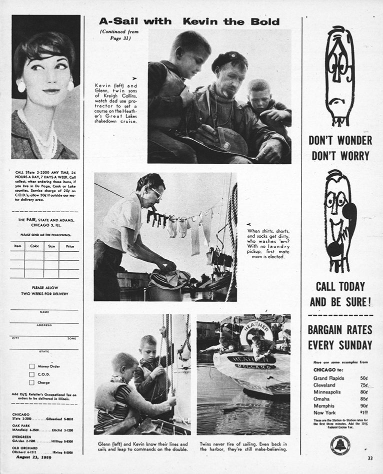 On August 23, 1959, a short photo-essay appeared in the Chicago Sunday Tribune Magazine. It described life aboard Heather for the Collins family as they prepared for their journey south. The short profile was a nice promotional piece for the artist, whose work appeared every Sunday in the Trib’s funny pages. (Sadly, it is likely the last promo the Tribune ran for Collins—four months later, after a nine-year run, KEVIN THE BOLD was discontinued.)