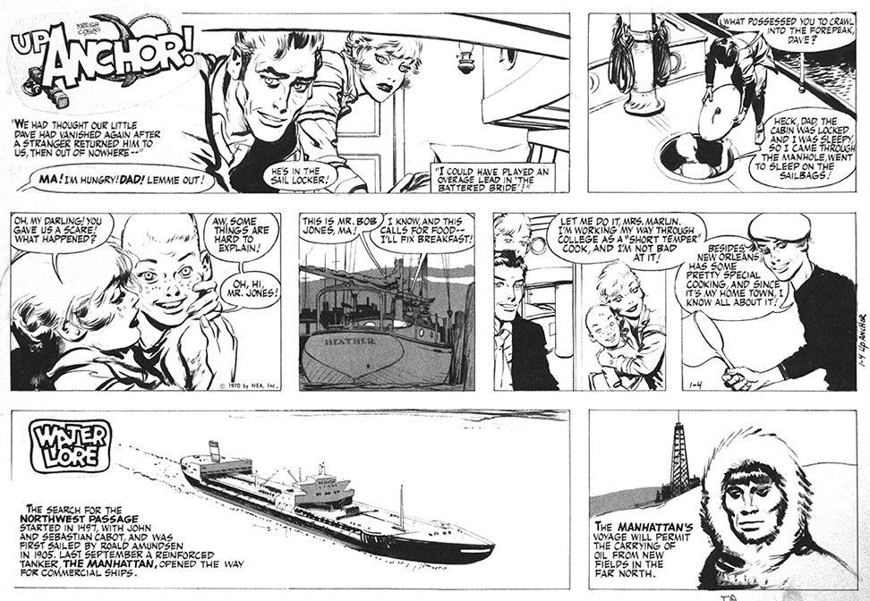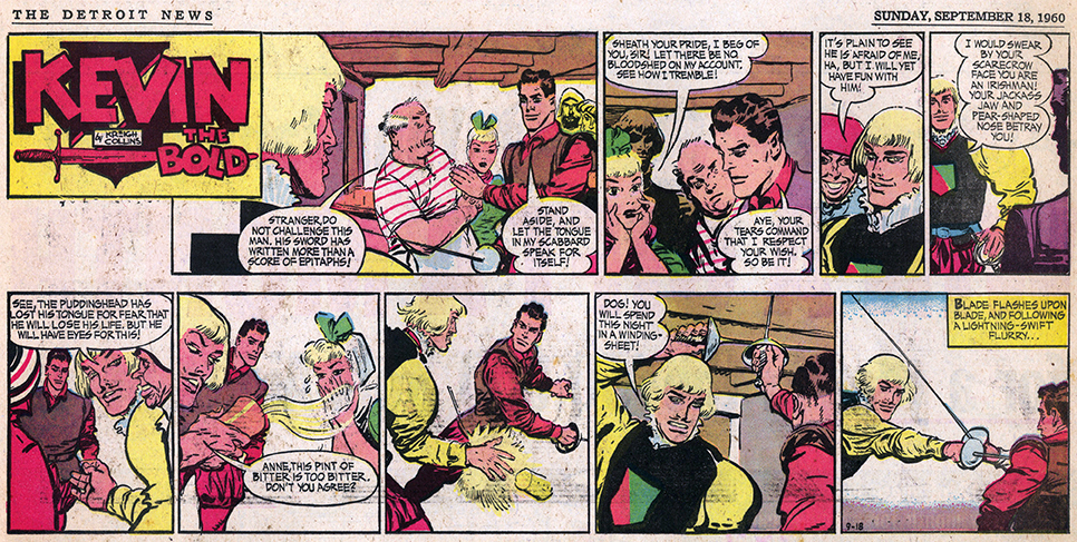 Finally, that question was answered—check the top of the article’s third column. Speaking of KEVIN THE BOLD, Collins is quoted as saying, “…the strip has been surprisingly well received. It now appears in Canada, South Africa, Yugoslavia, Sweden, France and other countries on the Continent. A very fine reproduction appears in the Manchester (England) Guardian.”