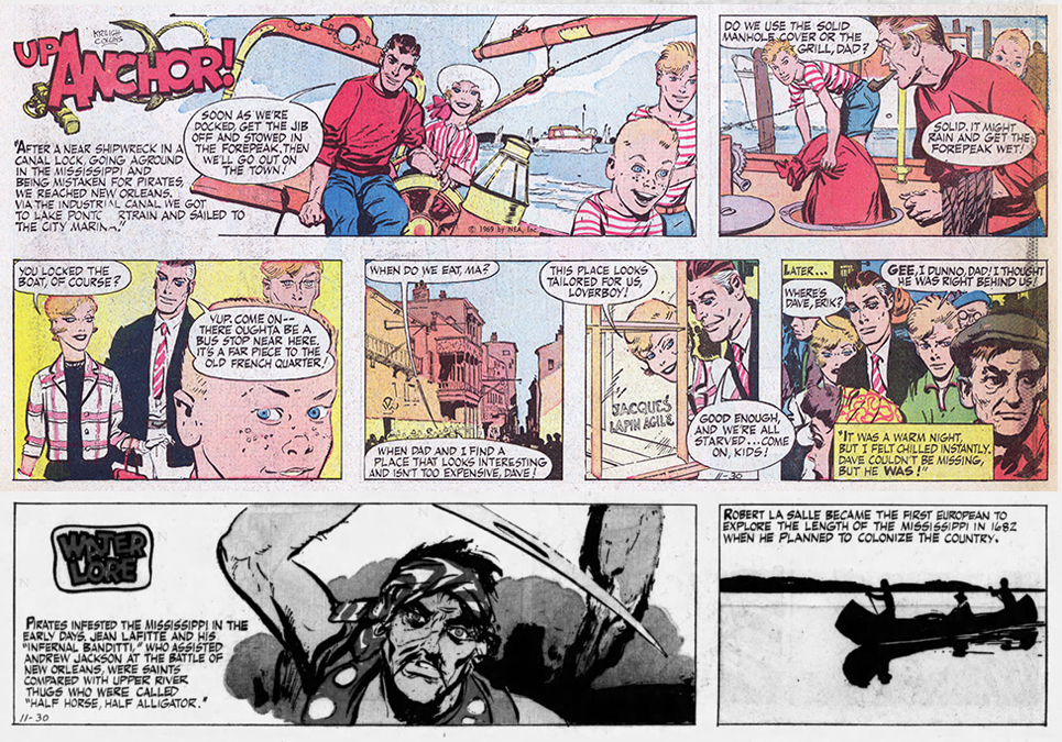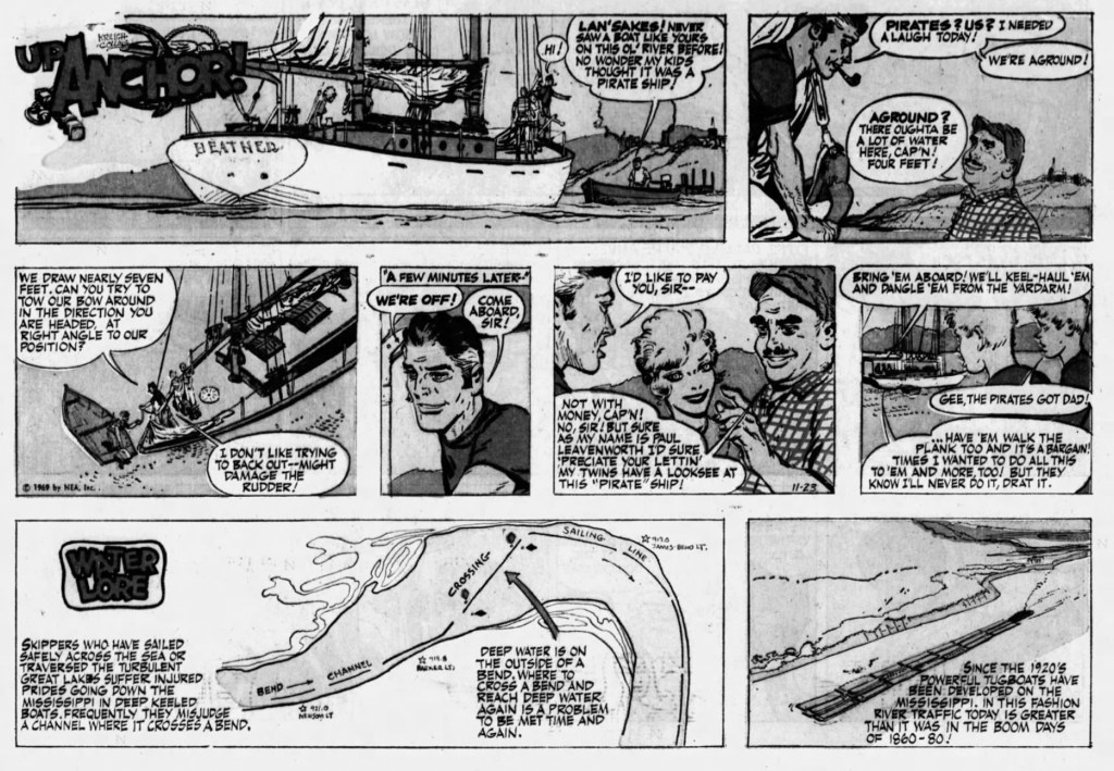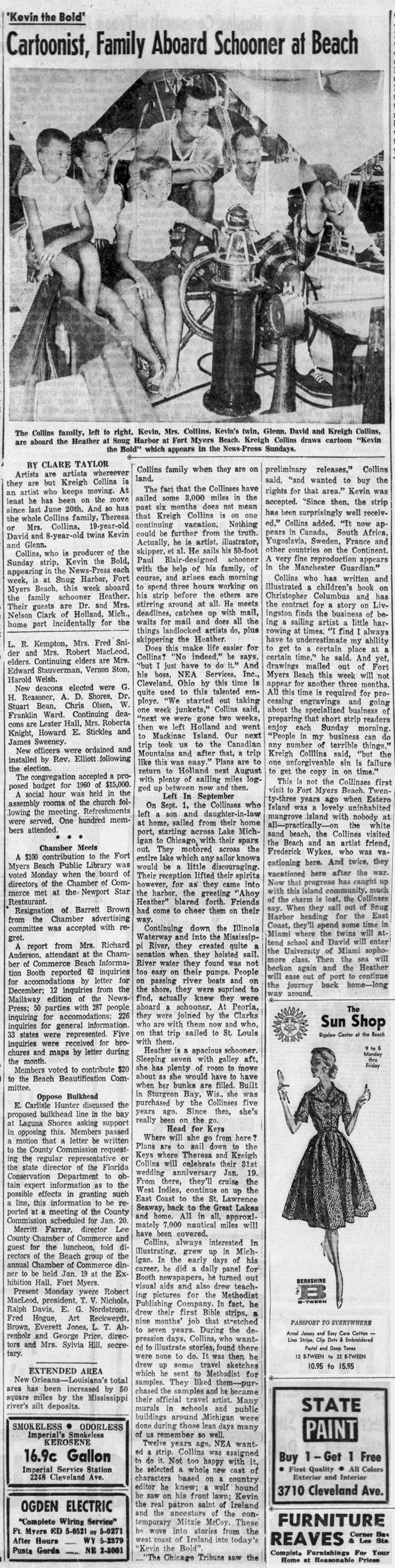 On this journey south, articles often appeared in the newspapers of the towns Heather and her crew visited. I don’t know if my grandfather acted as his own publicist, or if the mere sight of his boat drew reporters looking for some interesting local news (47-foot schooners were a rarity on the Mississippi). It certainly helped if the newspaper featured KEVIN THE BOLD in their comic sections. However they came about, the articles sometimes provided some interesting information, such as this one, from the January 13, 1960 Fort Meyers News-Press.