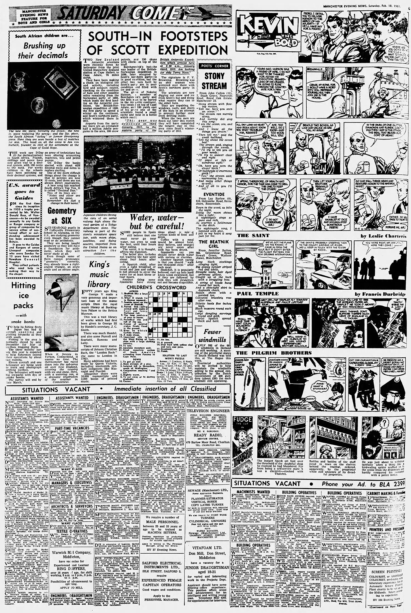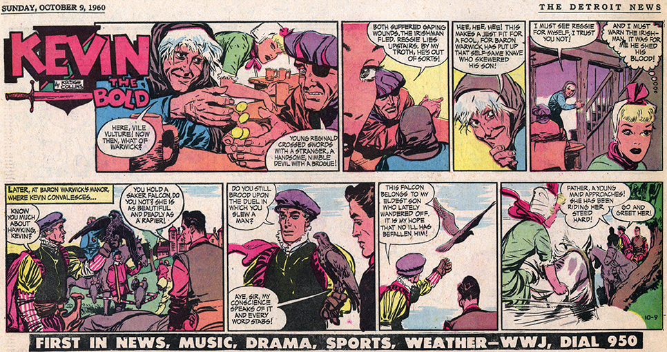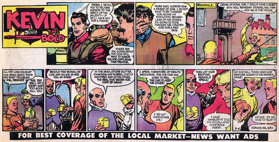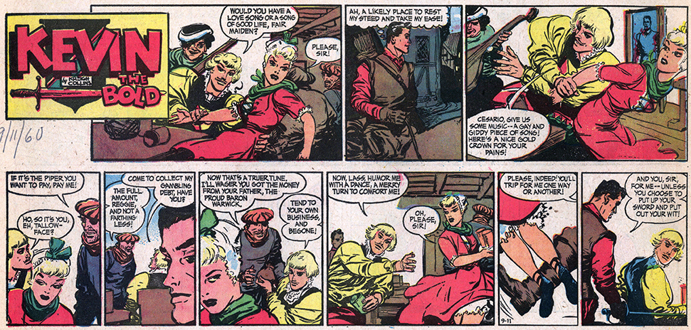 For six years, Henry VIII became a recurring KEVIN THE BOLD character; his swan song was September 16, 1962. (And no surprise, once ”Old Coppernose” was gone, the News dropped KEVIN). As part of the “Saturday Comet,” KEVIN appeared with a few other comic strips—likely Saturday dailies. The News occasionally labelled this section the “Evening News International Cartoon Page,” and KEVIN’s neighbors included THE SAINT, by Leslie Charteris, Francis Durbridge’s PAUL TEMPLE, plus THE PILGRIM BROTHERS and FUDGE THE ELF.