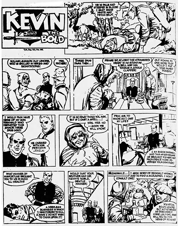 In its 21 July, 1956 edition, the Manchester Evening News (England) began to include KEVIN THE BOLD on its “Saturday Comet” kids page. These syndicated versions appeared five-plus months after their original NEA publication dates, and ran in a black and white tabloid format. The NEA likely pitched the News because of a new face being added to KEVIN’s roster—King Henry VIII.