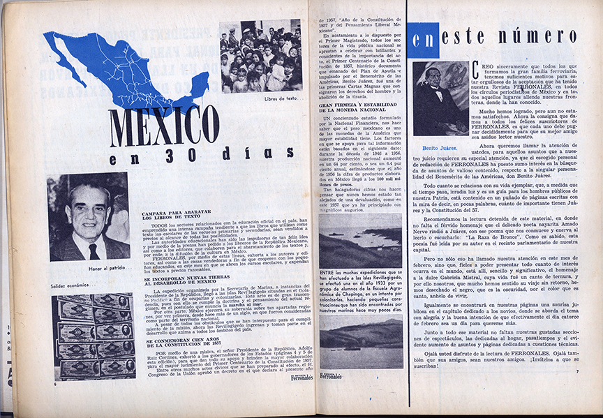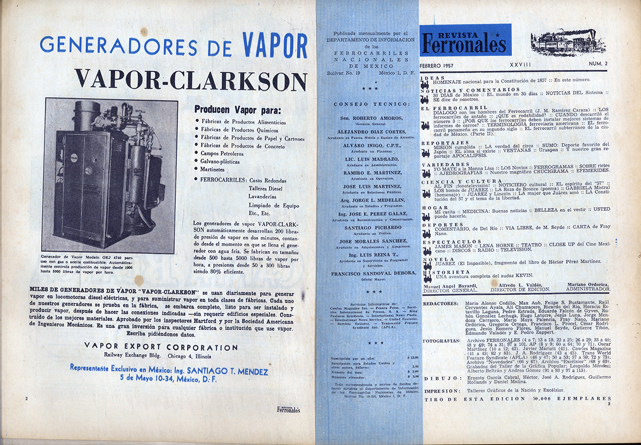 I recently acquired a copy of Revista Ferronales, a monthly magazine published by the Information Department of the National Railways of Mexico. Dated February, 1957, it is probably the heftiest magazine I’ve ever seen. The 132-page issue measures about 9″ x 11-5/8″ and weighs nearly a pound. Only its outside covers are printed using the four-color process, and the text pages are printed in two colors—black plus various spot colors. Despite its length, there are few ads inside.
