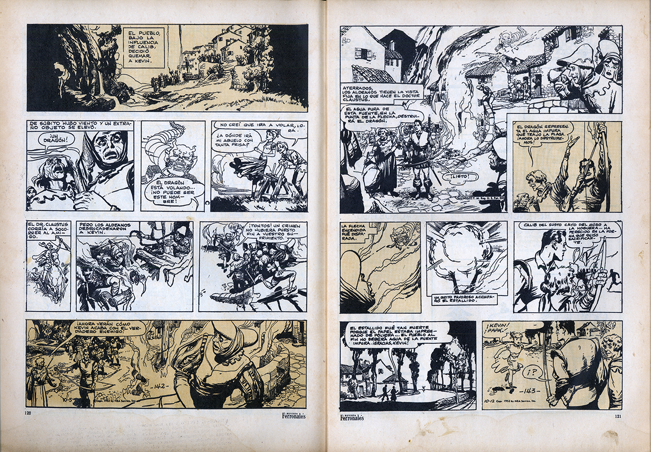 Spread over eight pages, Revista Ferronales features tabloid versions of the entirety of one of Kevin’s adventures, which featured Leonardo da Vinci. It was originally published in Sunday comics sections four-plus years earlier, in late 1952.