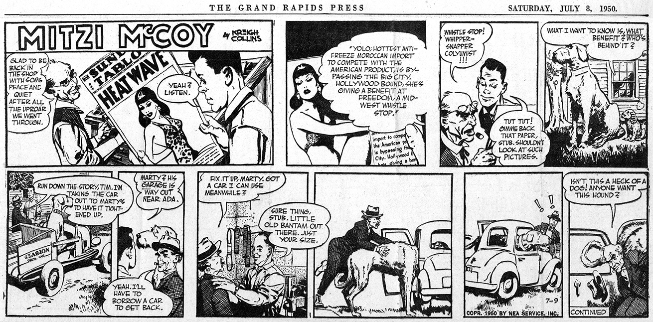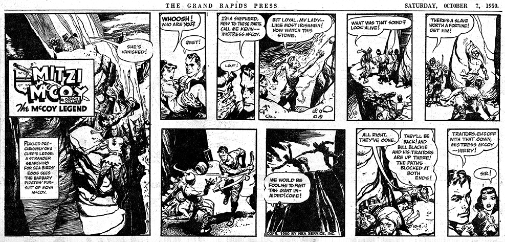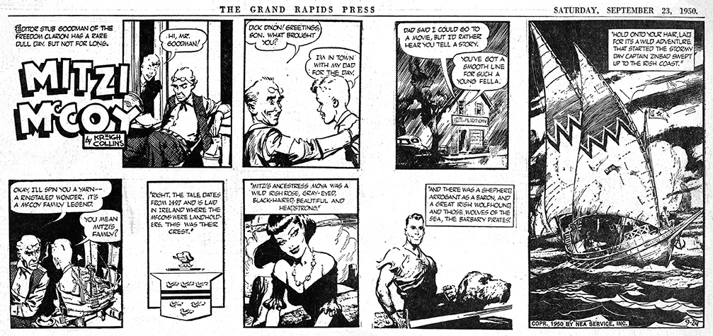 In the summer of 1950, MITZI McCOY started running in the Grand Rapids Press, which was not just Collins’ hometown newspaper, but a client. He had been doing illustrations for them since the beginning of his career, which began about 20 years earlier. (Collins also did work for another local daily, the Grand Rapids Herald).