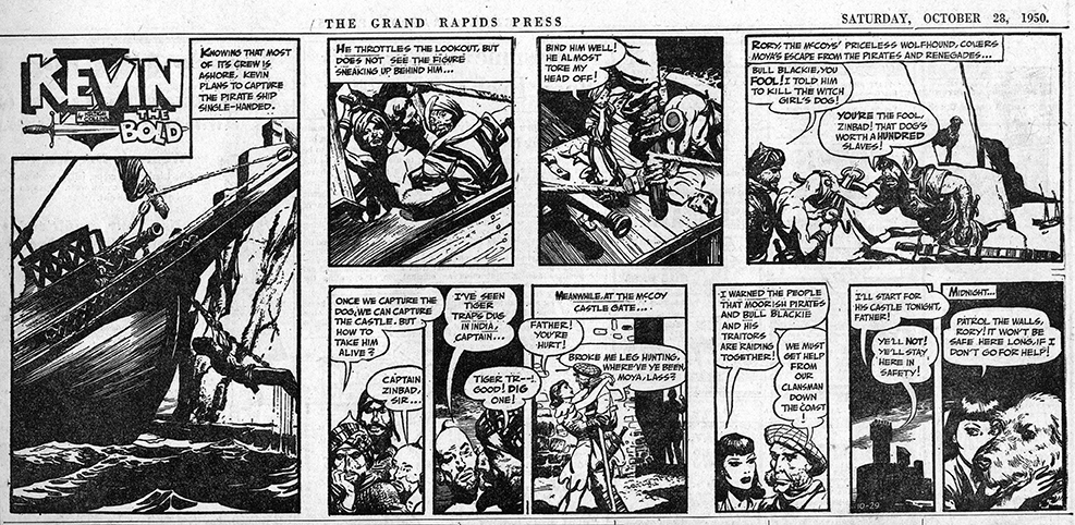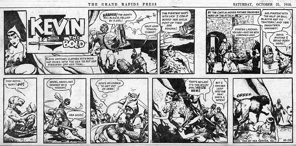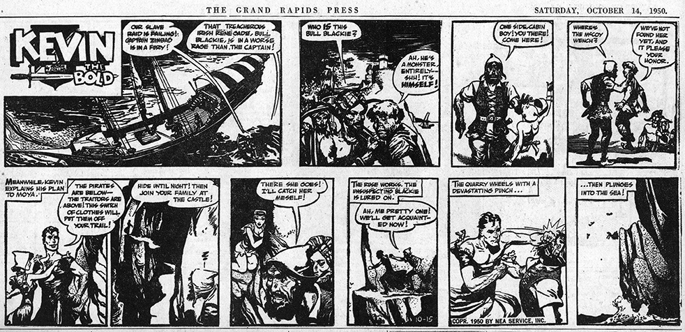 At any rate, readers of the Grand Rapids Press were the first to meet Kevin, as these episodes printed in the Saturday edition, scooping other Sunday readers. In it, Moorish pirates were raiding the Irish coast, looking for slaves.