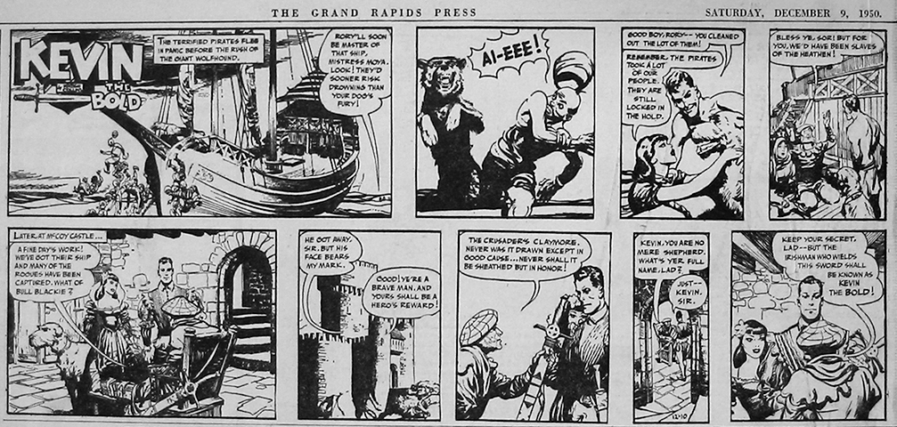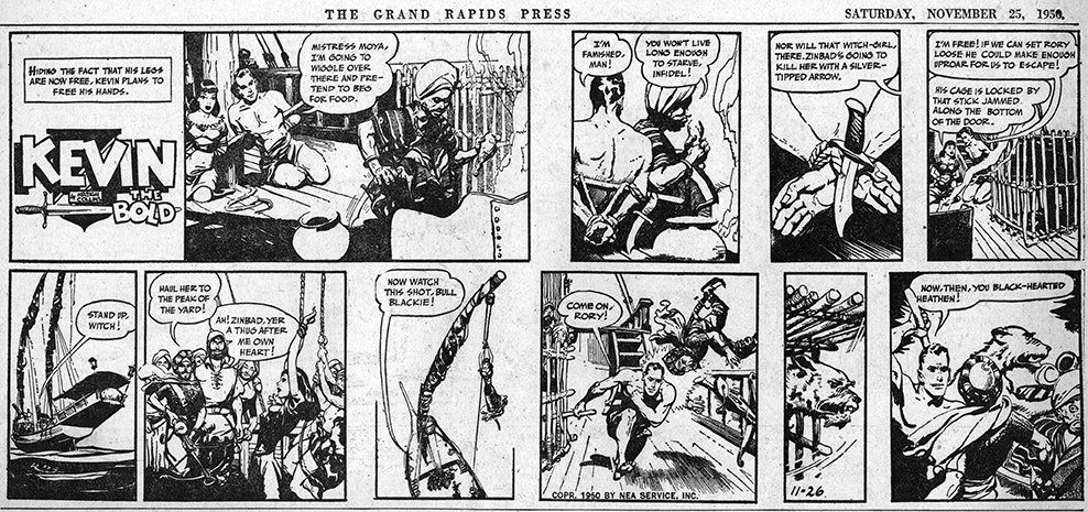 Before diving overboard, Kevin uses his cutlass to scar Bull Blackie’s face. His Zorro-like swordplay and dialog was recycled from a story Collins had written and illustrated approximately fifteen years earlier. (I think his short story was titled “T Stands for Traitor”—alas, I cannot find the original. But trust me, it’s somewhere in the Grand Rapids Public Library’s Special Collection #56, a must-see for fans).