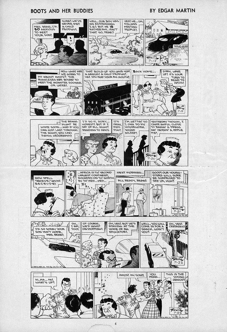 Kevin is followed on page 2 by a Sunday tabloid episode of Vic Flint (Dean Miller/Jay Heavilin). Page 3 includes half-tabloid versions of Boots and Her Buddies and Babe ‘n’ Horace/Boots Cutouts, with Boots and Her Buddies dailes the next page (all by Edgar Martin).