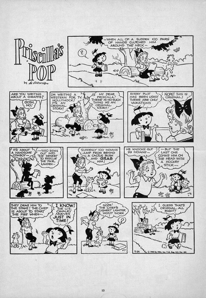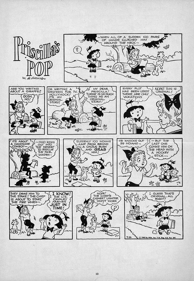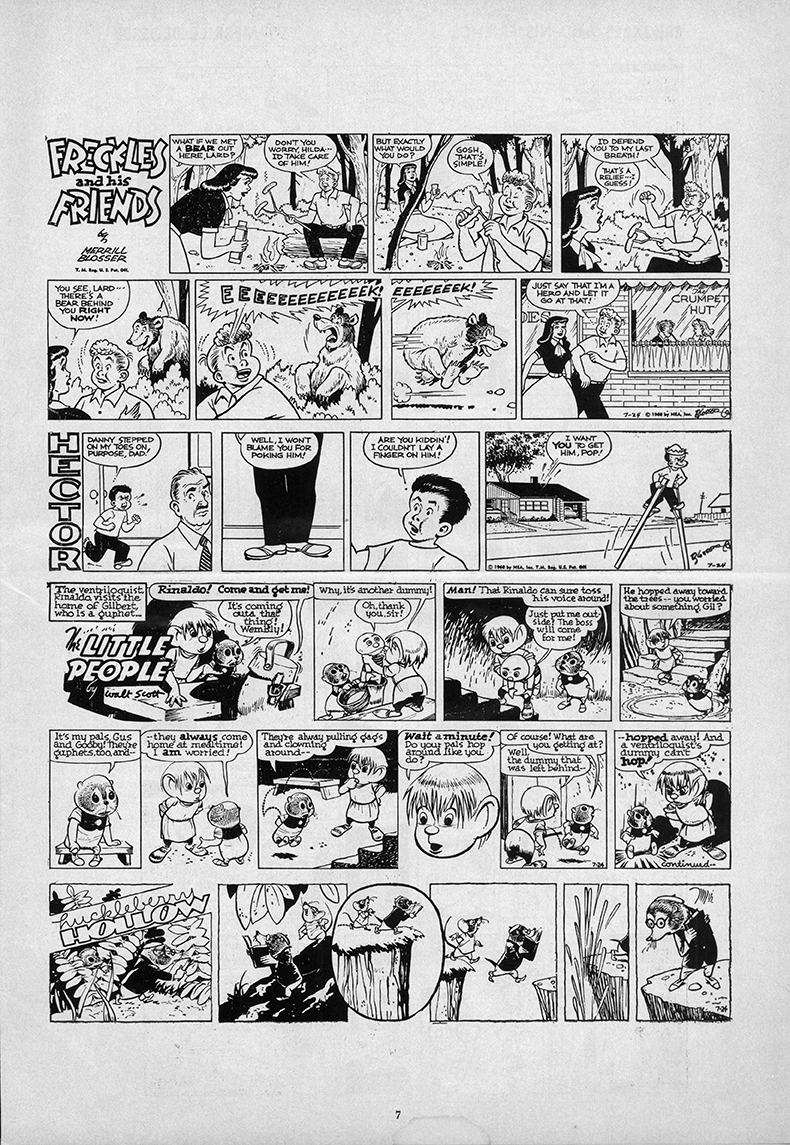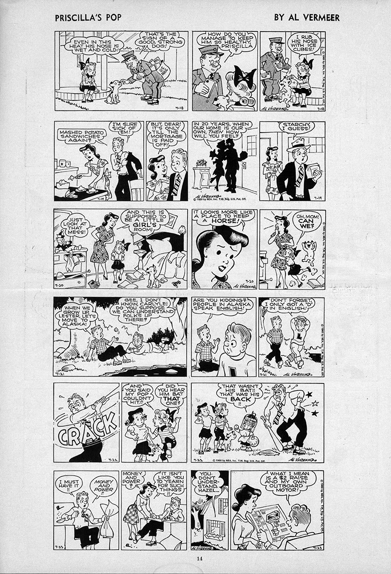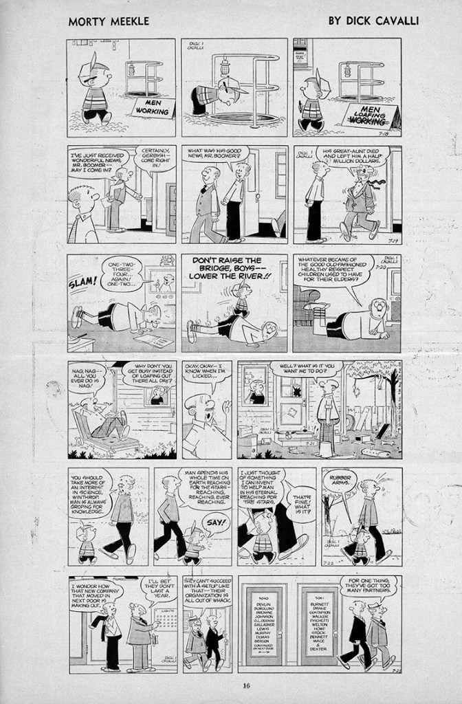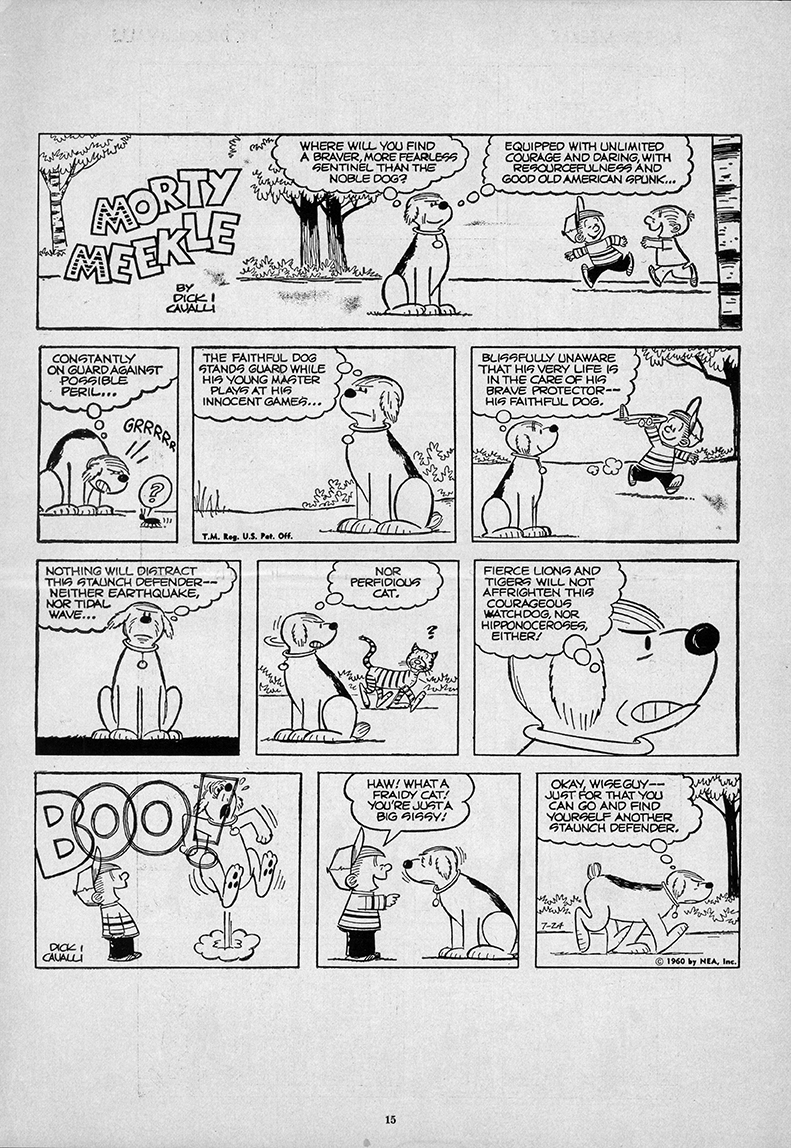 Next up is Al Vermeer’s Pricilla’s Pop (Sunday and dailies), followed by a new NEA title on pages 15–16, Dick Cavalli’s Morty Meekle. Outside of Kreigh Collins’ work, I’m not much of an authority on comics, but Morty’s cap looks mighty familiar. Sure enough, this title later evolved into a strip I remember as a kid—Winthrop. (I wasn’t much of a fan).