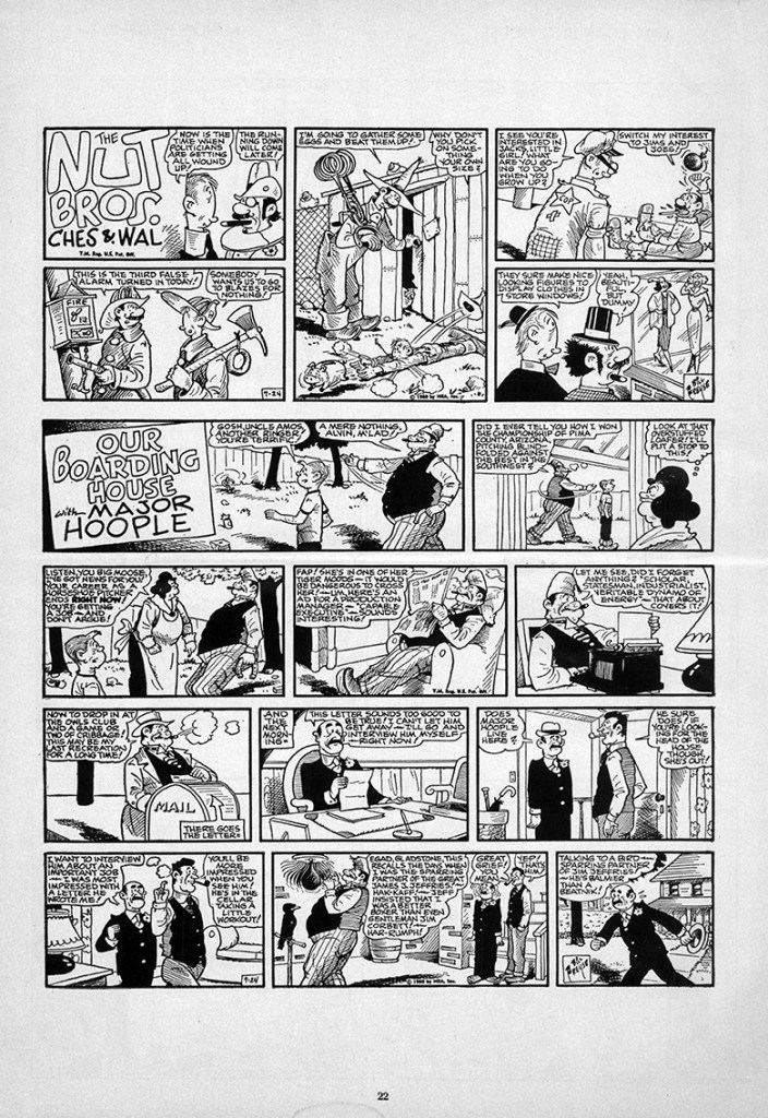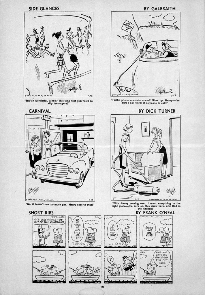 On page 21 are six days of single-panel Our Boarding House with Major Hoople dailies, and on page 22, the Sunday tabloid, which includes Bill Freyes’ topper strip The Nut Brothers. Pages 23 and 24 include the single-panel comics Side Glances (by Galbraith), Carnival (by Dick Turner), and Short Ribs (by Frank O’Neal).