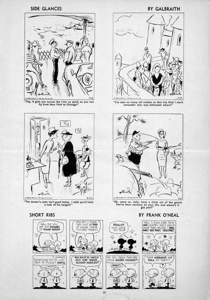 Although the supplement was dated July 18, the Sunday episode of KEVIN it featured ran on July 24, 1960. (The supplement contains NEA’s daily comics from July 18–23 plus their July 24 Sunday-only features). This episode came from the middle of the Dover Pirates chapter.