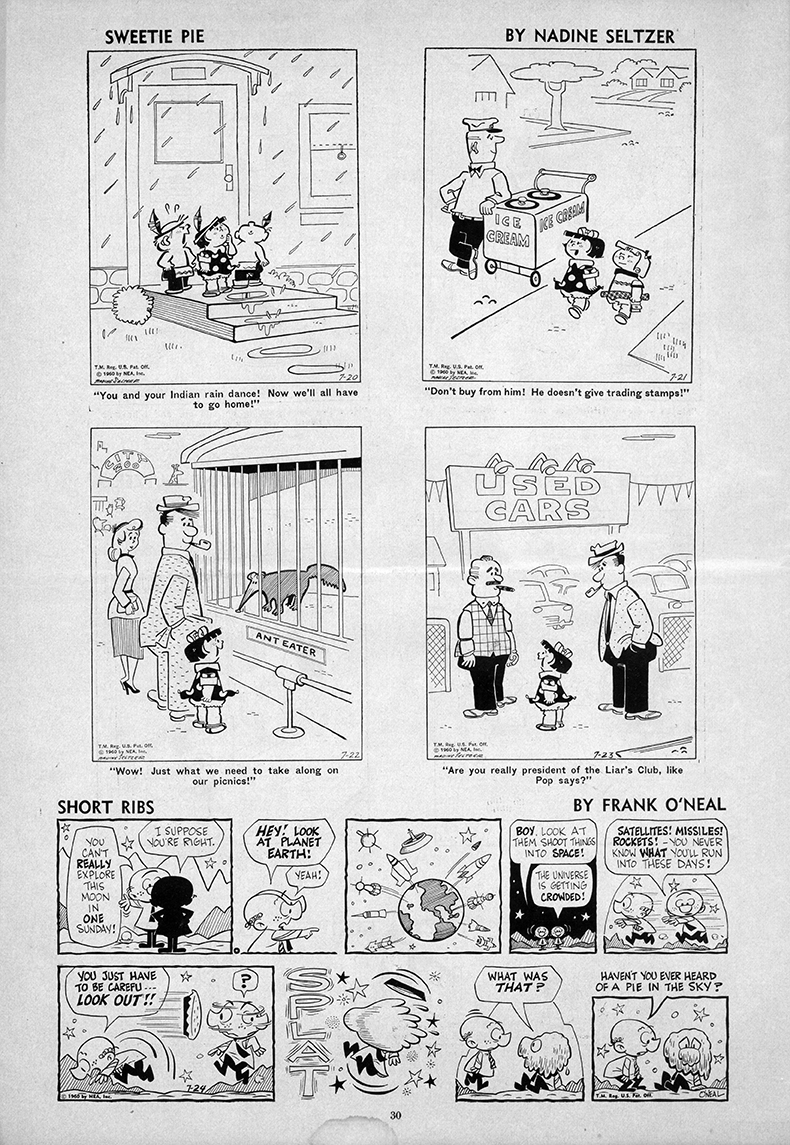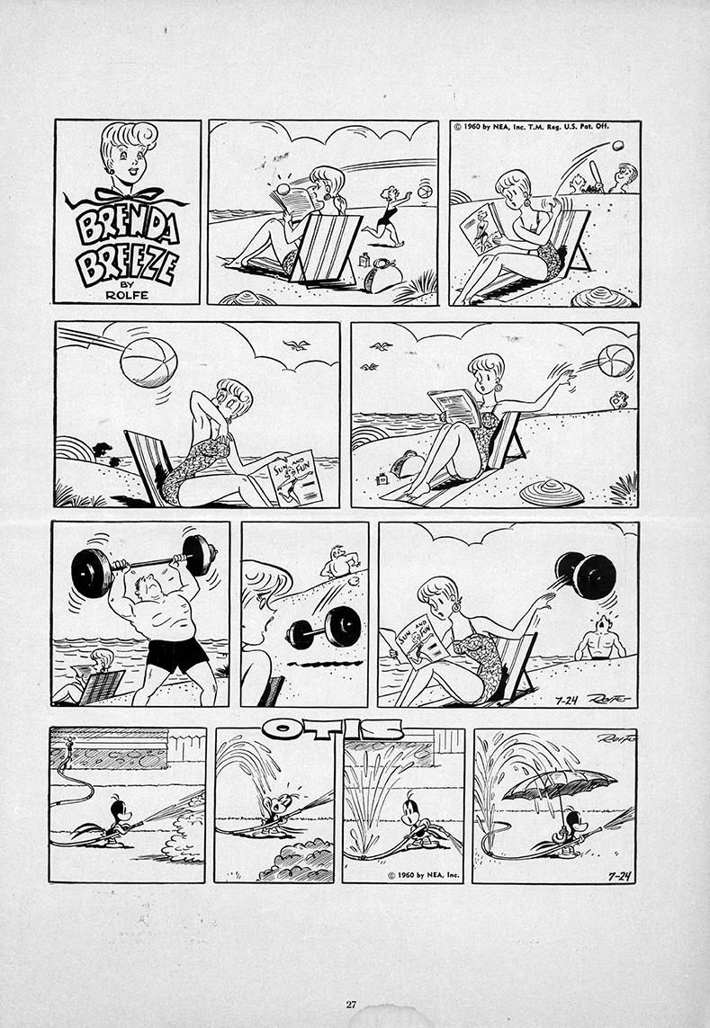 Pages 25 and 26 feature more single-panels: Carnival (Dick Turner), Short Ribs, plus Turner’s Sunday topper strip Mr. Merryweather. These are followed by Rolfe’s Brenda Breeze Sunday (with Otis as a topper) and several panels of Kate Osann’s Tizzie and Little Liz.