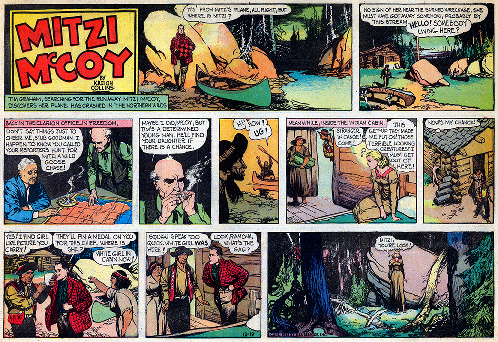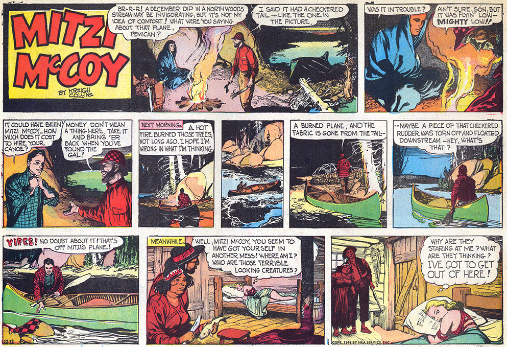 The episode is packed with more arresting content—a racing canoe, a suggestively posed and unconscious Mitzi, her burning aircraft, and some stereotypically-depicted Indigenous people (whose conversation quickly brings Mitzi back to consciousness). Collins availed himself to his “Do You Know—” canoe reference material a second time for this episode. Having launched his career as the Great Depression began, Kreigh had learned the virtues of thriftiness.