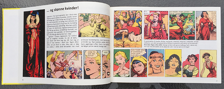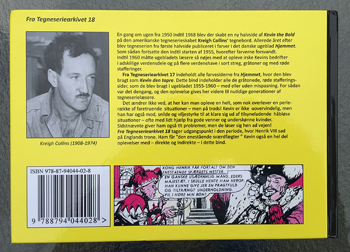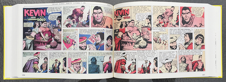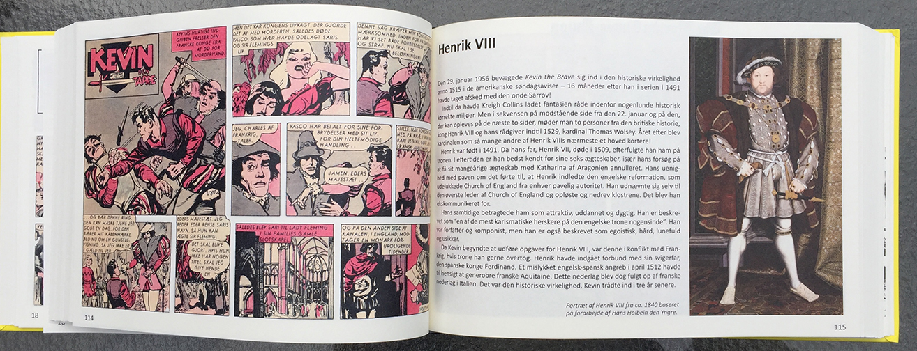 In many instances, the original, full-color episodes precede their corresponding three-color Danish versions for easy comparison. When King Henry VIII enters Kevin’s world, a full-page sidebar offers some background of the English monarch. Considering the book’s 218 Danish episodes, plus all the extras, it results in a rather hefty volume—364 pages in all.