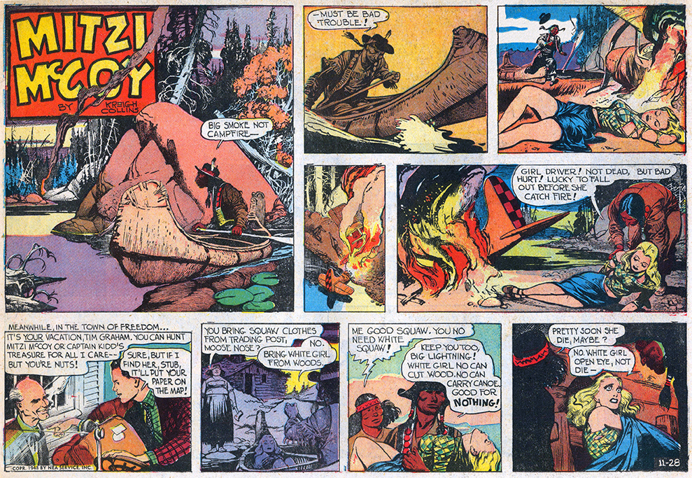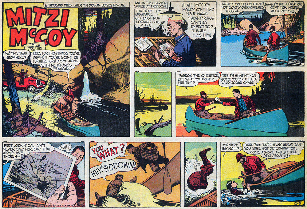 MITZI McCOY ran from 1948 to 1950 and showcased Kreigh Collins’ skill as an illustrator and storyteller. His picturesque landscapes, lovely character designs, and thrilling action sequences brimmed with detail and charm, and the strip’s ensemble cast rotated in and out of the spotlight taking turns as protagonists in the dozen story arcs collected in this volume. The last story collected in “The Complete Mitzi McCoy” is the narrative bridge that set Collins and his characters off on a new journey, beautifully told for the next couple of decades in the much-lauded adventure strip Kevin the Bold.