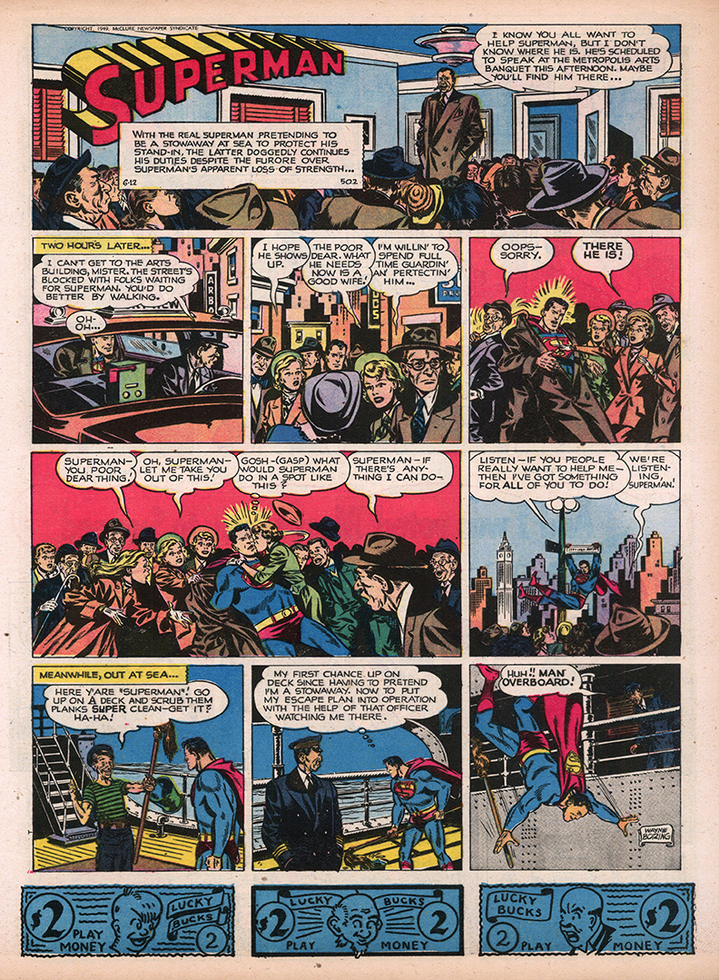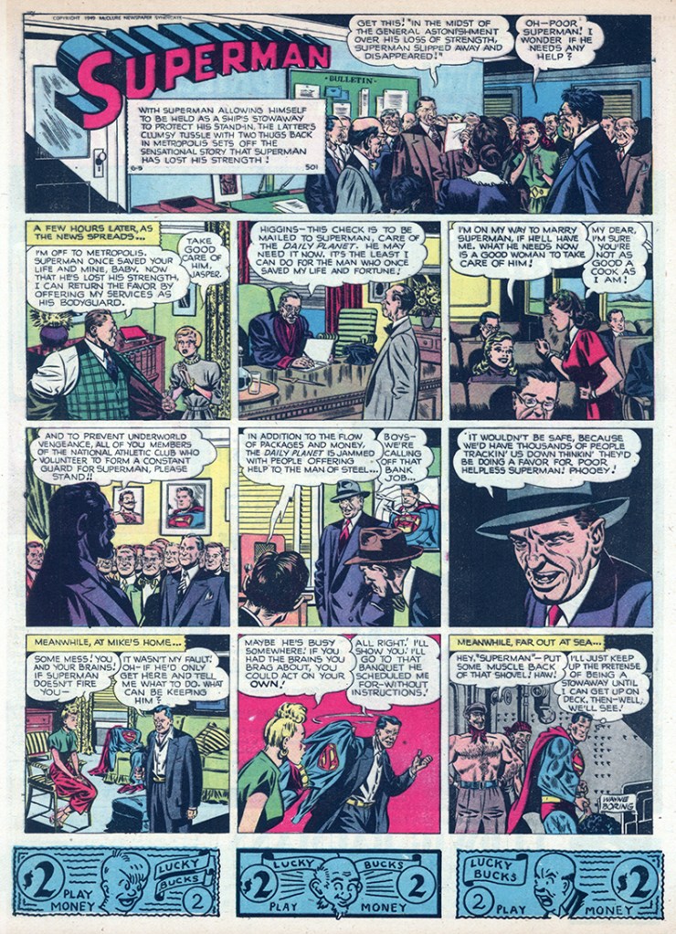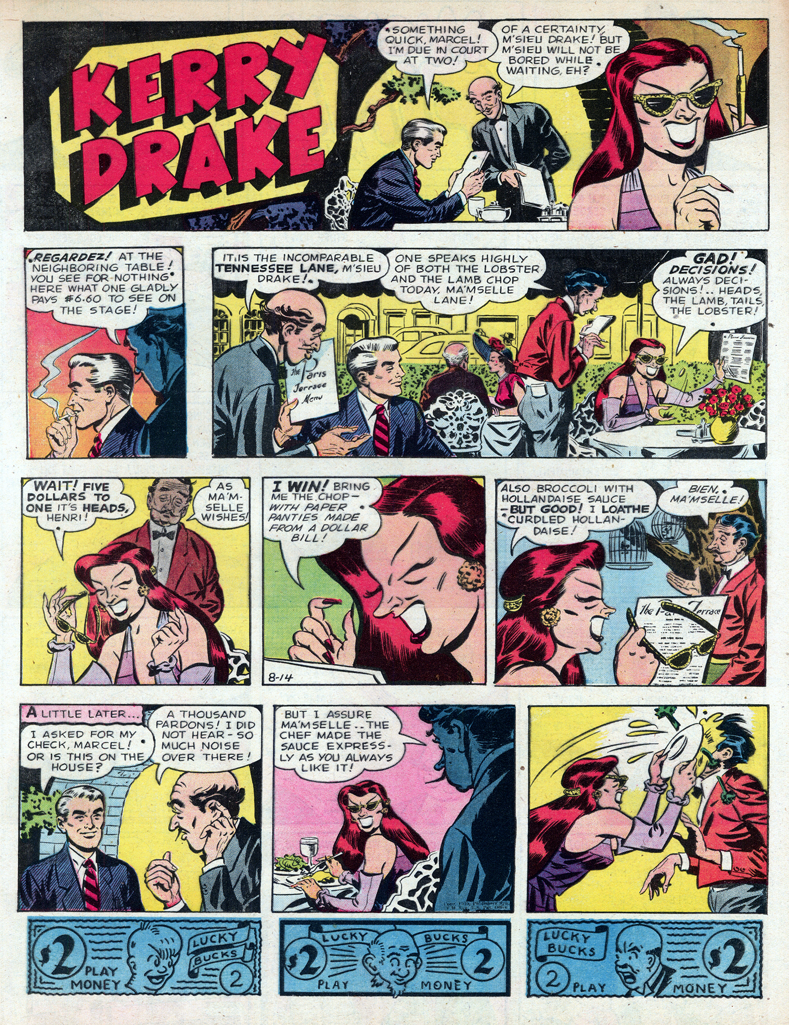 Here is another Sunday Times Mirror section I acquired while putting together The Complete Mitzi McCoy. There are fewer ads than usual—if the Mirror’s ad sales department was slacking off, that just meant more full-page episodes and fewer half-tabloids. As usual, Ham Fisher’s “Joe Palooka” leads off, followed by Milt Caniff’s “Steve Canyon” and “Mickey Finn,” by Lank Leonard. Next up is “Kerry Drake,” by Alfred Andriola/Allen Saunders and Frank Miller’s “Barney Baxter in the Air,” with each page filled out with a few $2 bills of play money. Harry Hanand’s silent comic “Louie,” and “Superman” by Wayne Boring (and likely Stan Kaye) follow.