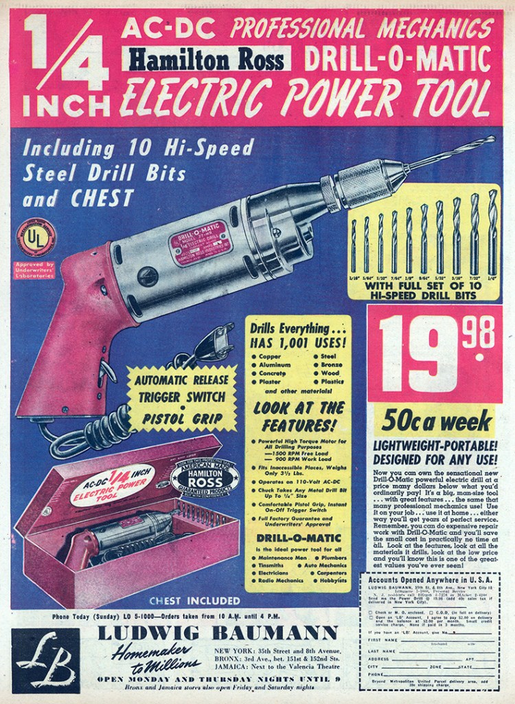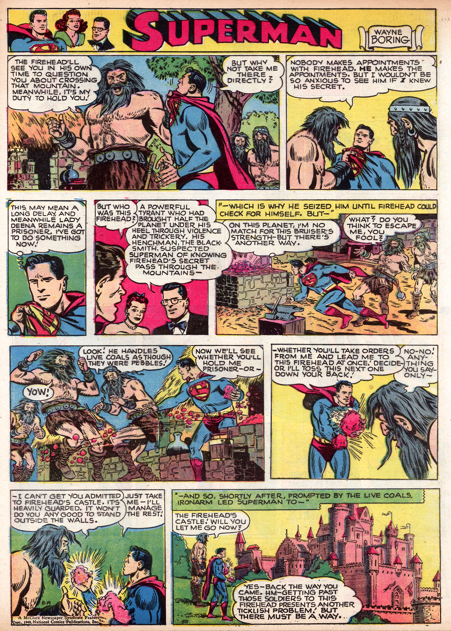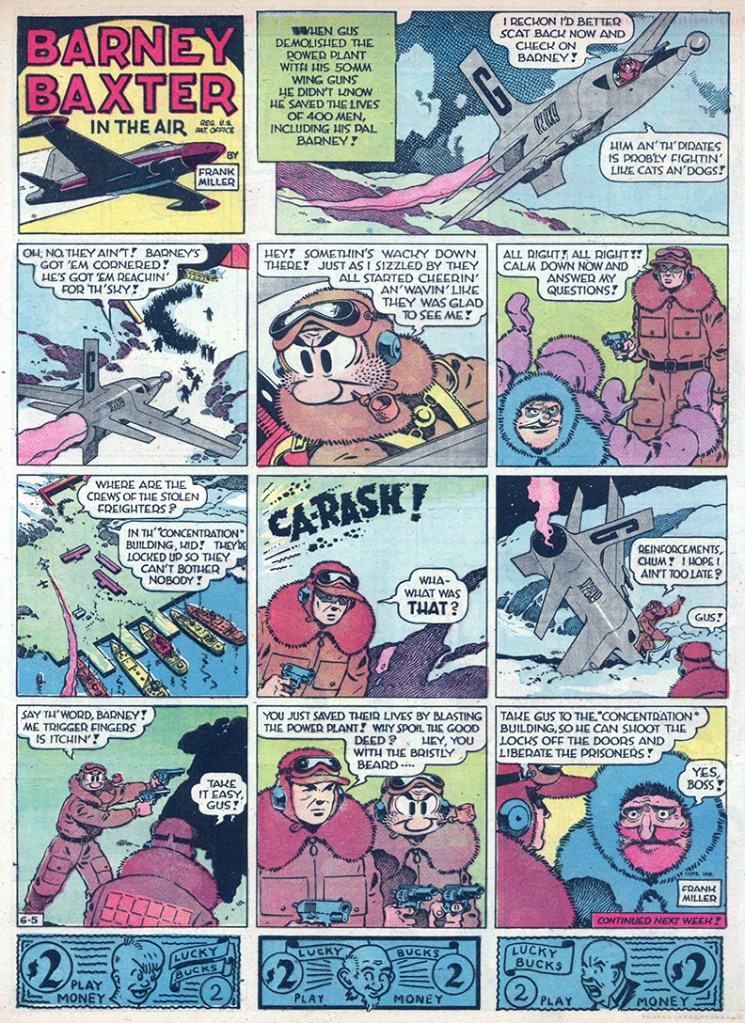 As usual, Ham Fisher’s JOE PALOOKA ran on the front page, followed by Milton Caniff’s STEVE CANYON and MICKEY FINN by Lank Leonard. Next up are KERRY DRAKE (Alfred Andriola/Allen Saunders), SUPERMAN (Wayne Boring), an ad for Ludwig Bauman electric drill (boring in more ways than one), and Frank Miller’s BARNEY BAXTER IN THE AIR.