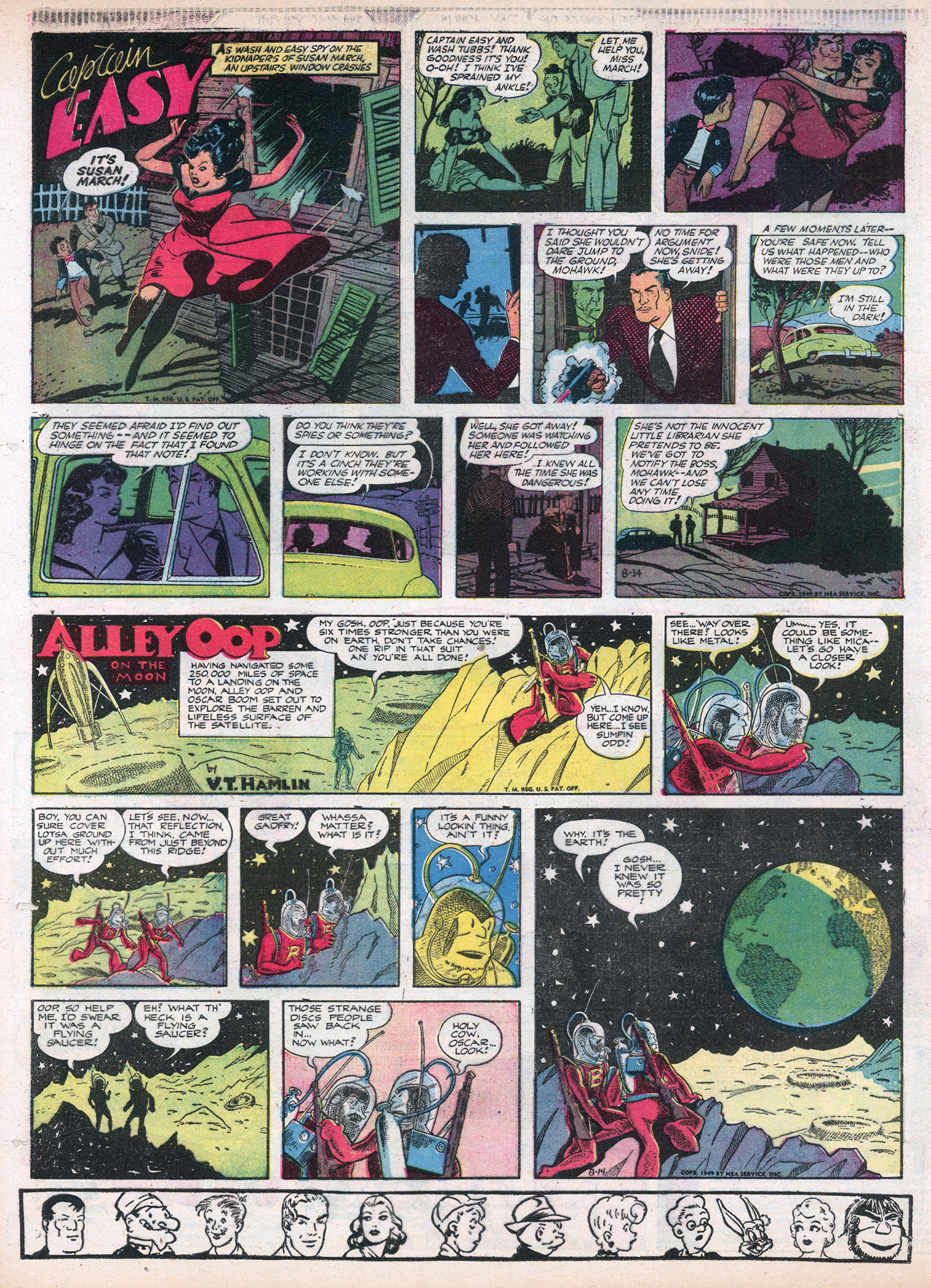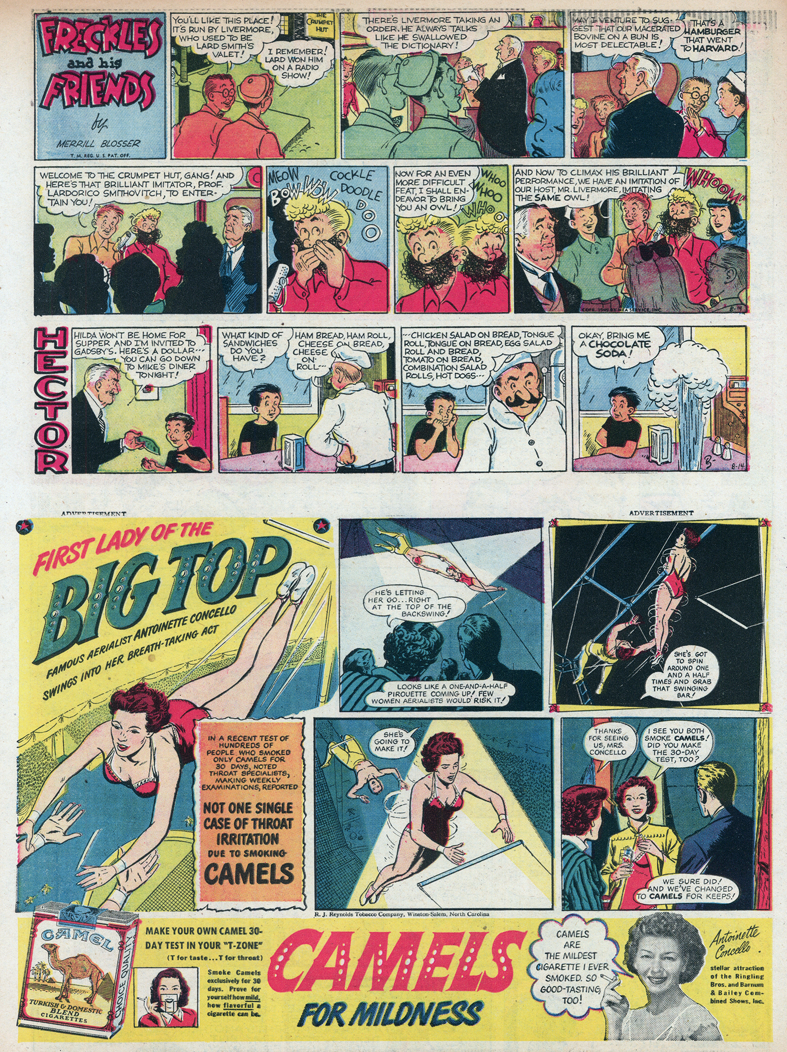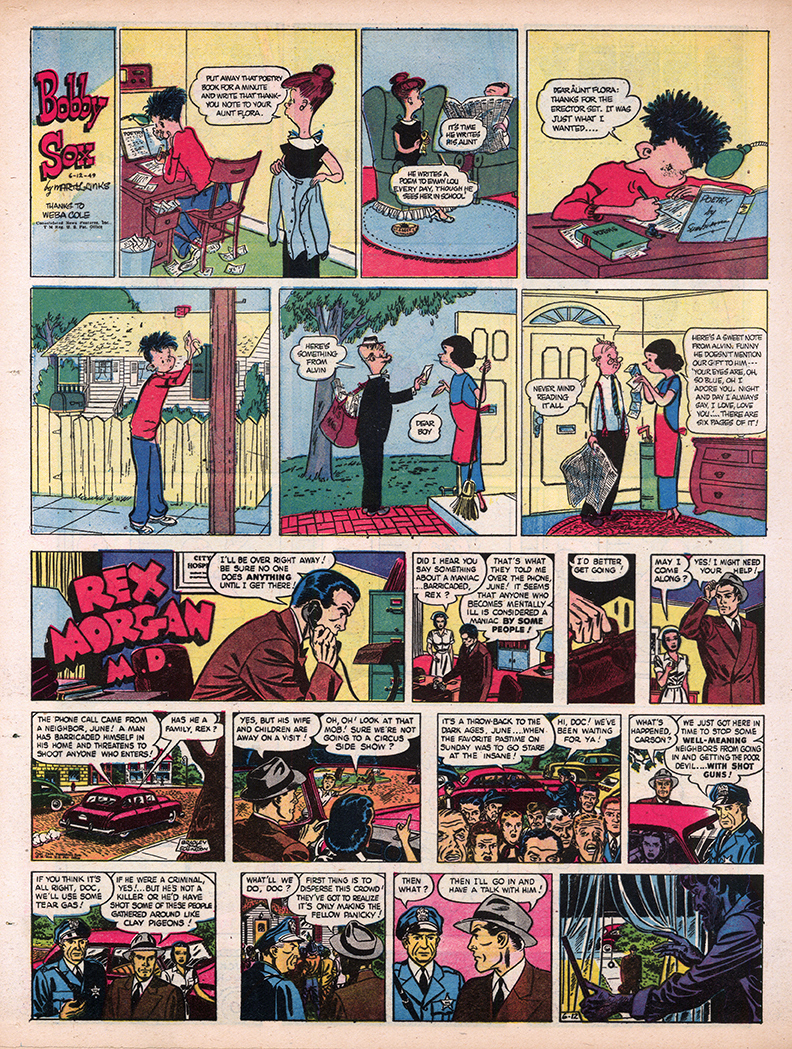 Roy Crane’s “Captain Easy,” drawn here by Walt Scott, and V.T. Hamlin’s “Alley Oop” face a couple of nondescript advertisements for Dr. Lyon’s Tooth Powder and Danderine. Next up are “Bobby Sox” by Marty Links, “Rex Morgan, MD” by Bradley and Edgington, “Boots” by Martin, and Merrill Blossar’s “Freckles and His Friends” (plus the topper “Hector”).
