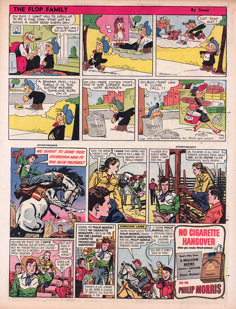 Found in the comics section’s center spread was the half-tab “Mitzi McCoy” episode I was looking for. Lacking an appearance by its titular character, it is one of my favorite episodes nonetheless. Beneath “Mitzi” is a pretty sweet ad for Rinso detergent; facing that is “The Flop Family” by Swan, alongside a Phillip Morris cigarette ad.