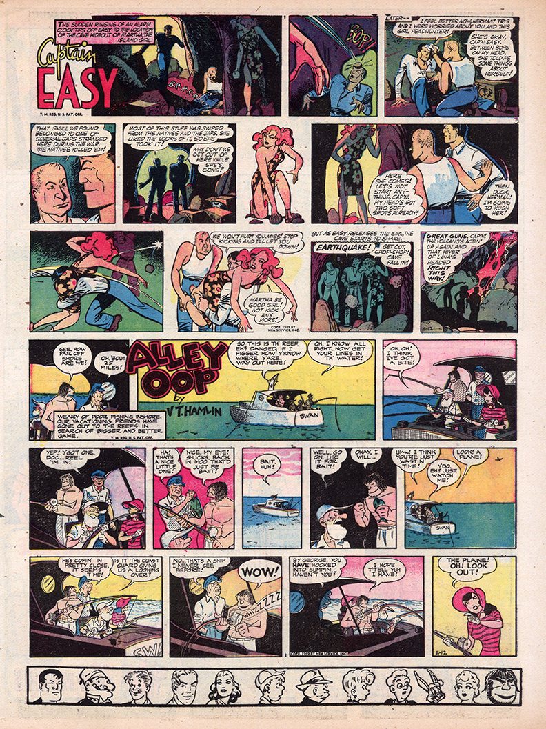The back page of the comic section had two more McNaught titles (Lank Leonard’s Mickey Finn and McEvoy and Stribel’s Dixie Dugan), as well as the the NEA’s popular feature Alley Oop, by V.T. Hamlin.