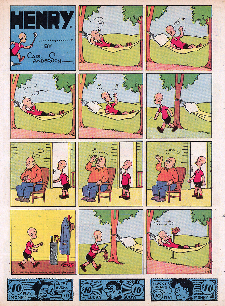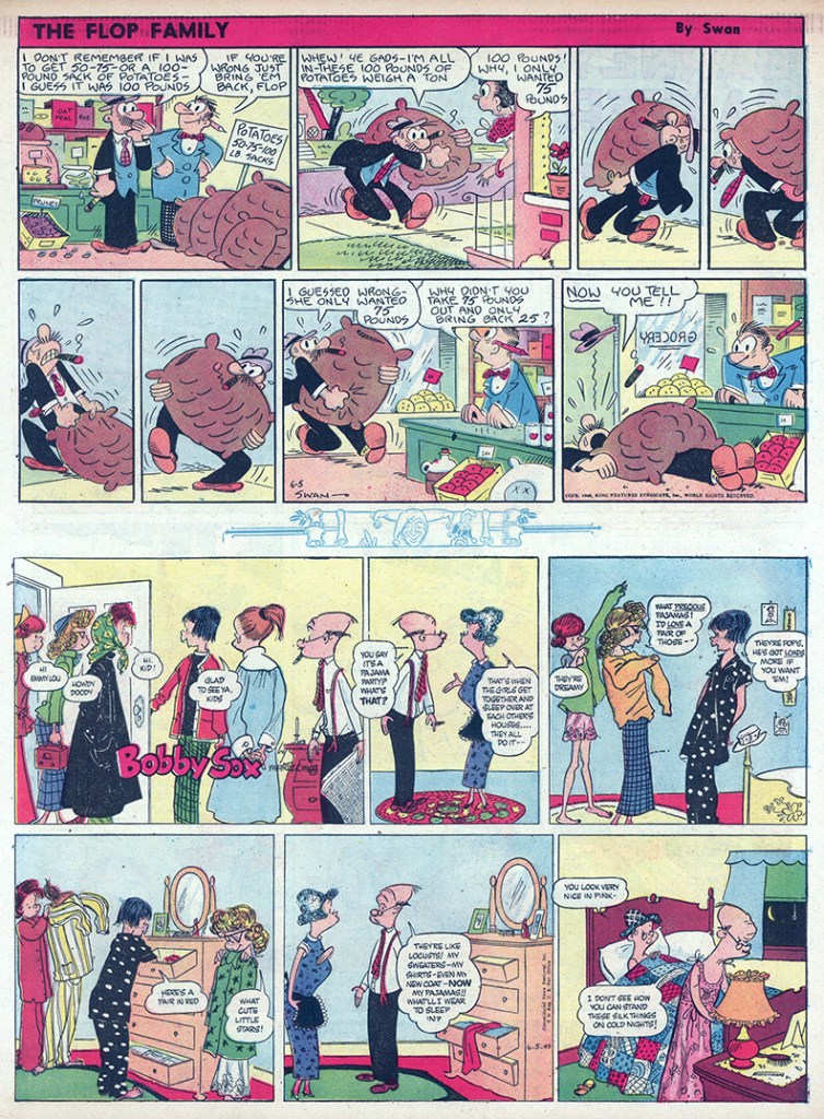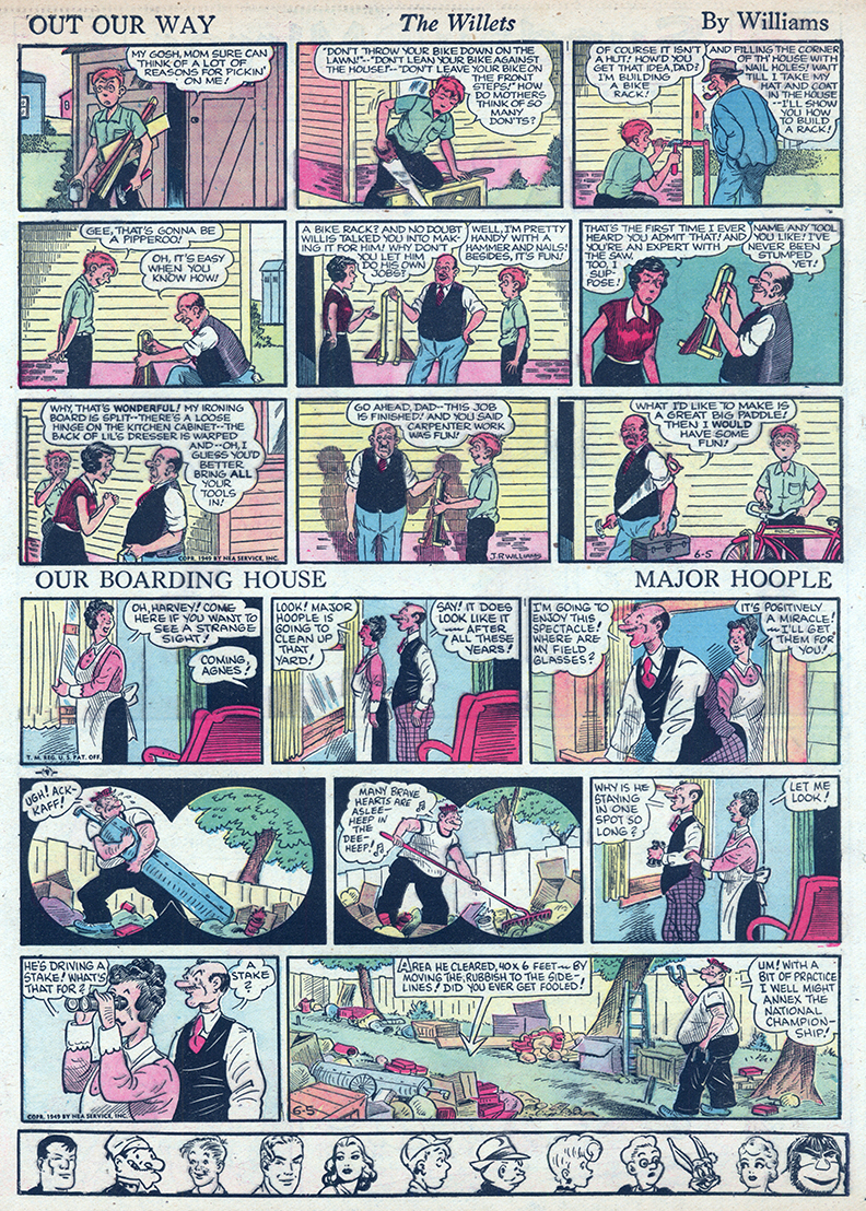 Next up, “Rex Morgan, MD” by Bradley and Edgington (with a nice, custom footer), and “Boots” by Martin, sharing the page with an ad for Colgate Dental Cream. Sometimes the ads in these old sections are charming, but this one is pretty obnoxious (and typical of the era). Roy Crane’s “Captain Easy” (drawn here by Walt Scott?) and V.T. Hamlin’s “Alley Oop” share the next page, followed by “Henry” by Carl Anderson. While “Captain Easy” and “Alley Oop” get the NEA footer, “Henry” features more play money, this time it’s big money—sawbucks! (I wonder if any kids ever cut these out? If so, then “Mickey Finn,” “Louie,” and “Bobby Sox” paid the price by being on the flip side). Two more split pages follow, “The Flop Family” by Swan with “Bobby Sox” by Marty Links, and “Out Our Way featuring the Willets,” by J.R. Williams, and “Our Boarding House.”