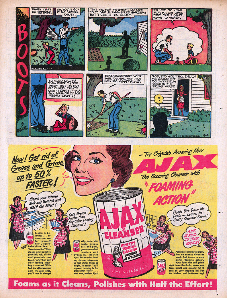 Roy Crane’s “Captain Easy” and V.T. Hamlin’s “Alley Oop” share the next page; by “Henry” by Carl Anderson follows. Next up, “Bobby Sox” by Marty Links, and “Rex Morgan, MD” by Bradley and Edgington. Sharing the page with an ad for Ajax Cleanser is “Boots” by Martin. Harry Hanand’s “Louie” follows, sharing a page with a nicely illustrated Pepsi ad. Then it’s “Out Our Way featuring the Willets,” by J.R. Williams, and “Our Boarding House.”